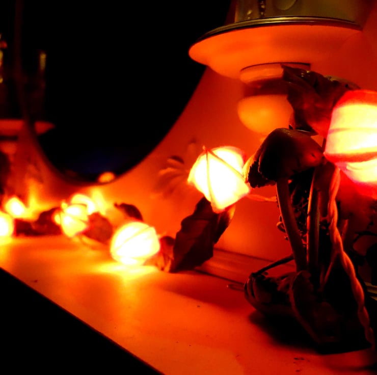 I adore orange lights for the soft warm comforting glow they impart to any room or setting you put them in. The magical Chinese lantern plant has pumpkin shaped pods that give out that glow, and with that in mind, I've crafted a set of string lights festooned with silk Physalis pods.