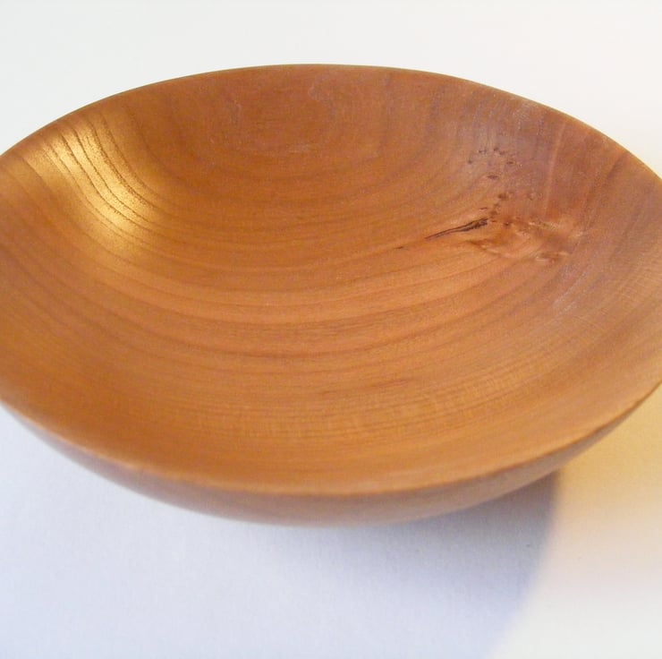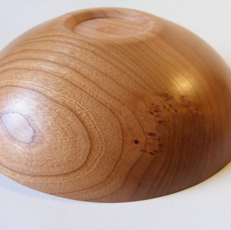 Cherry burr bowl, 132 x 39mm high, A lovely piece of Cherry with some beautiful grain and an area of burr figuring. The bowl has a gently curving shape and a narrow foot making an elegant piece.