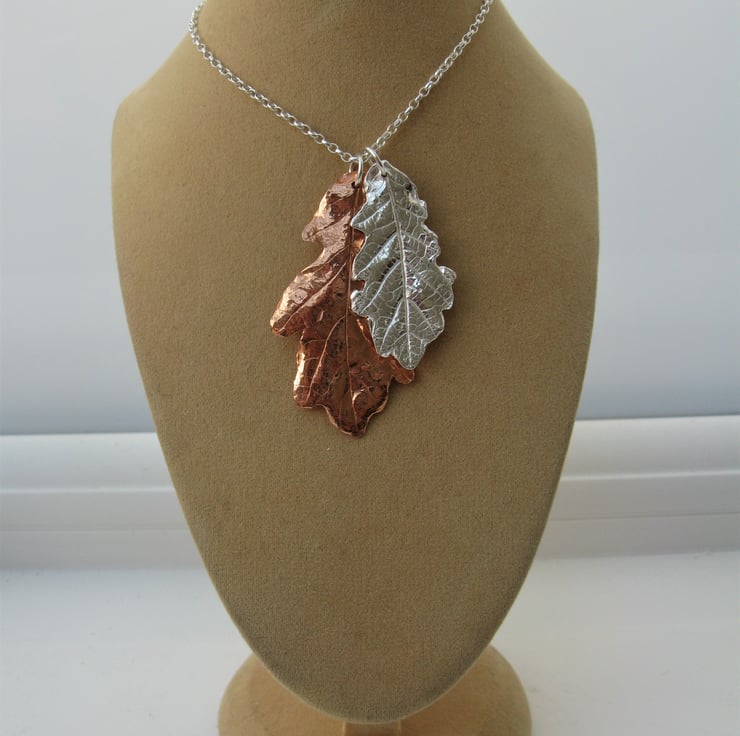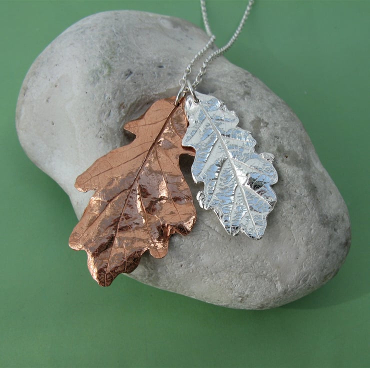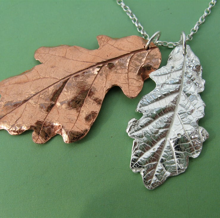 This stunning and truly unique necklace was made by coating two real oak leaves in multiple layers of recycled fine silver (pure silver) and copper. Detailed replicas of the leaves are left after firing.