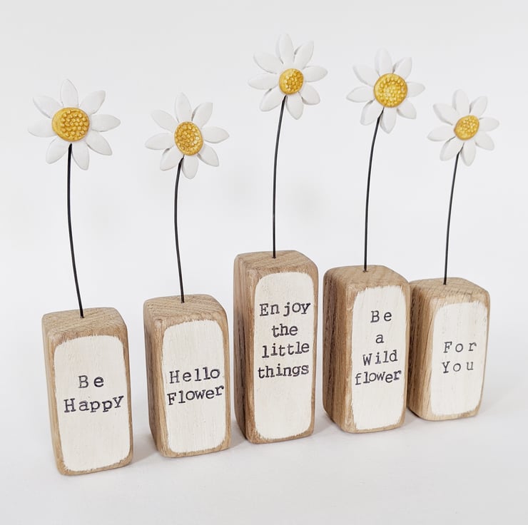 A little clay daisy stands on a wire stalk in a sanded and stamped oak wood block.