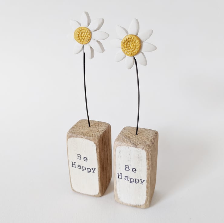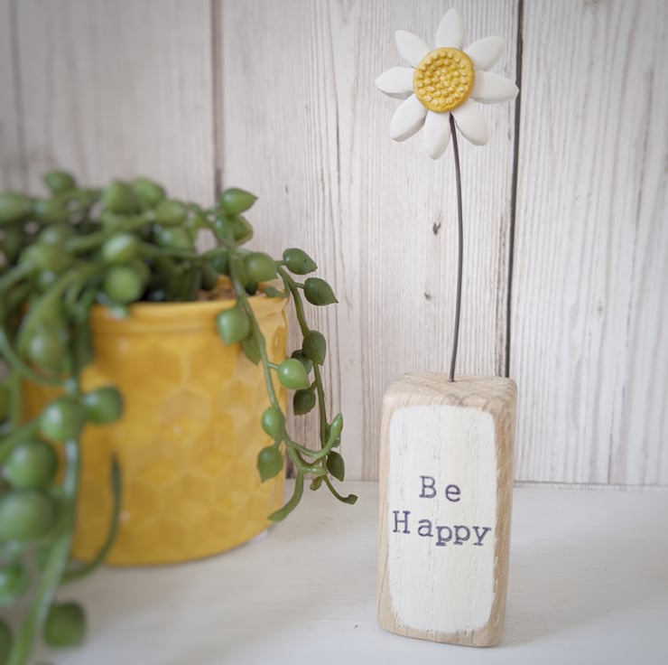 The clay daisy flower is made from polymer clay. This is hand moulded and patterned, fired and painted to finish.