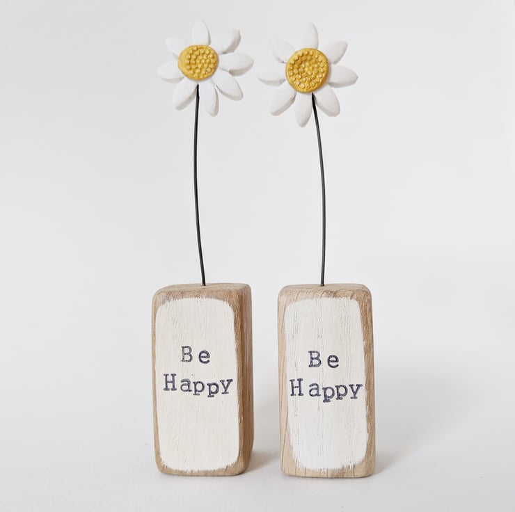 The front of the wooden block is hand stamped with the words 'Be Happy'