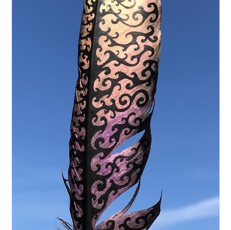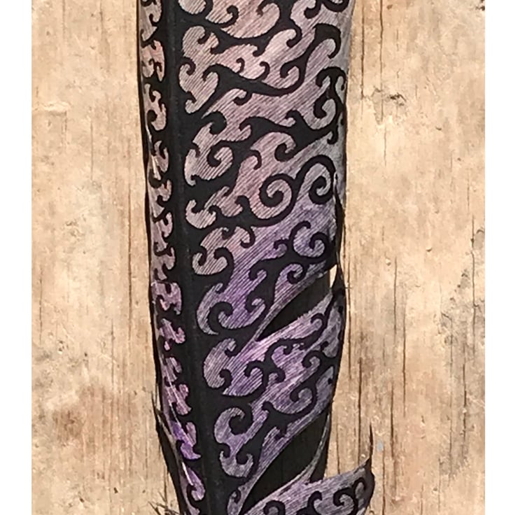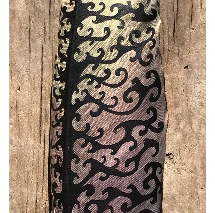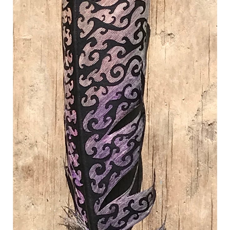 A seagull feather painted with pearlescent shades fading from gold to violet/purple, with curling black patterns superimposed.