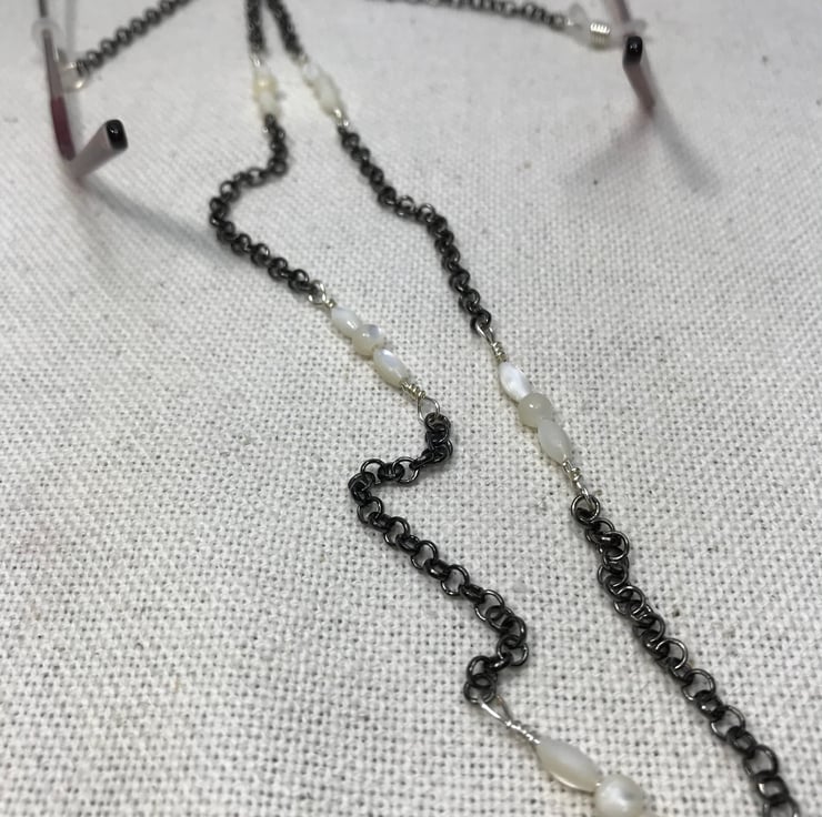 Spectacle glasses chain or sunglasses lanyard in a black rolo chain with Mother of Pearl beads & clear rubber holder/ends. Never lose your glasses/sunglasses again! The perfect stocking filler or gift.