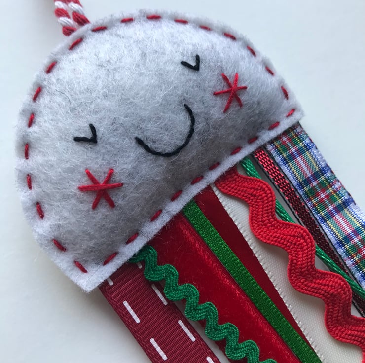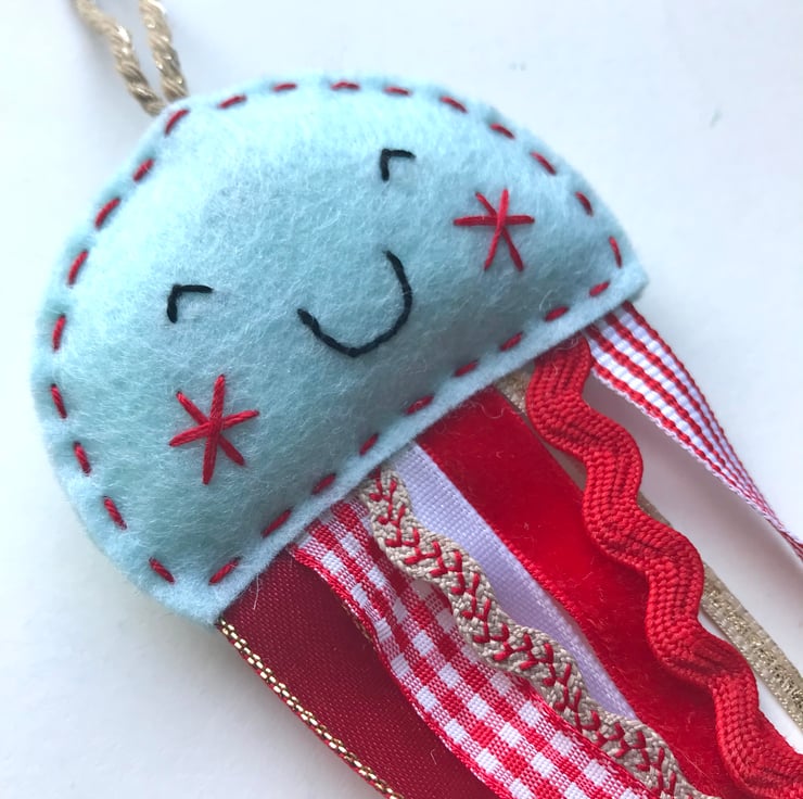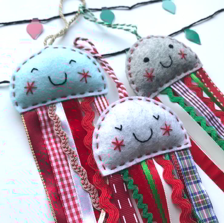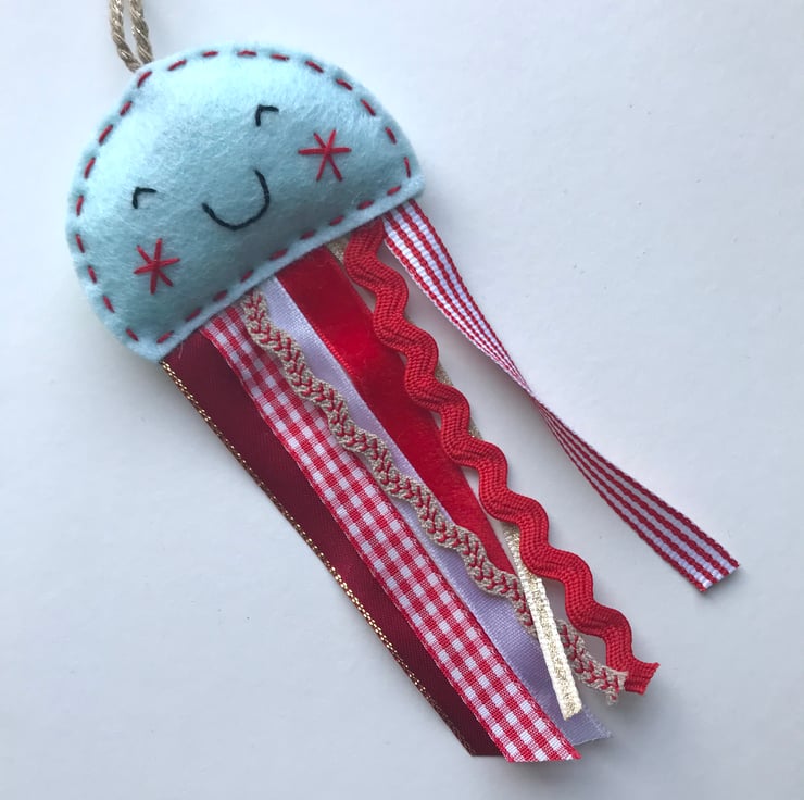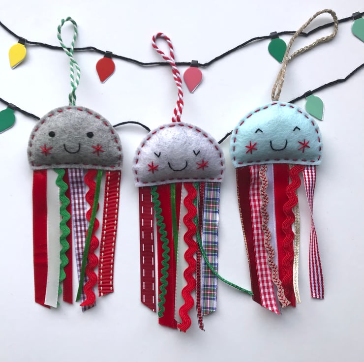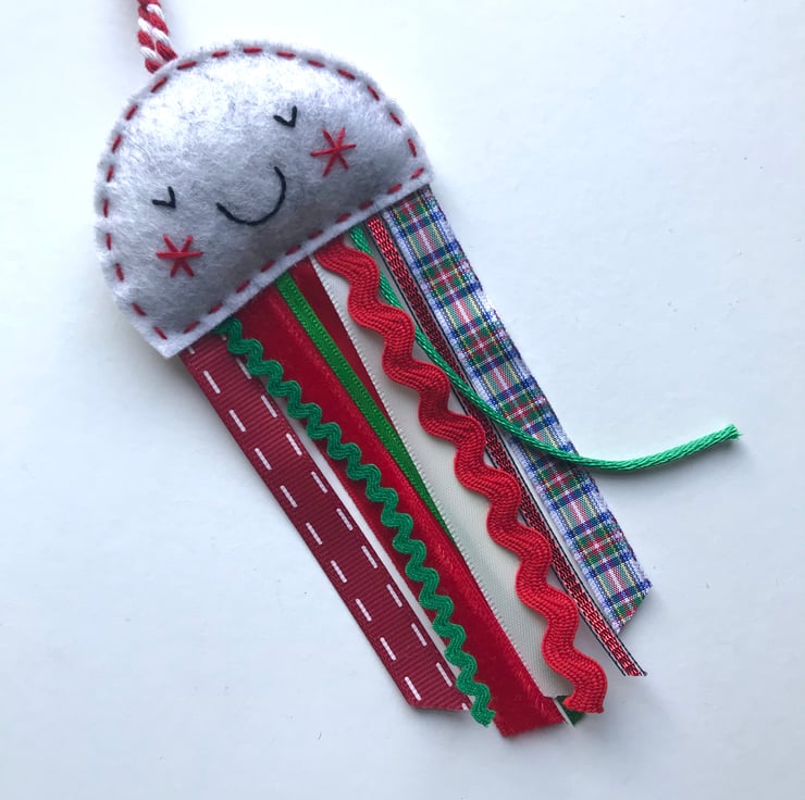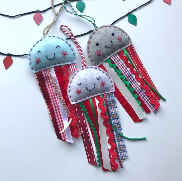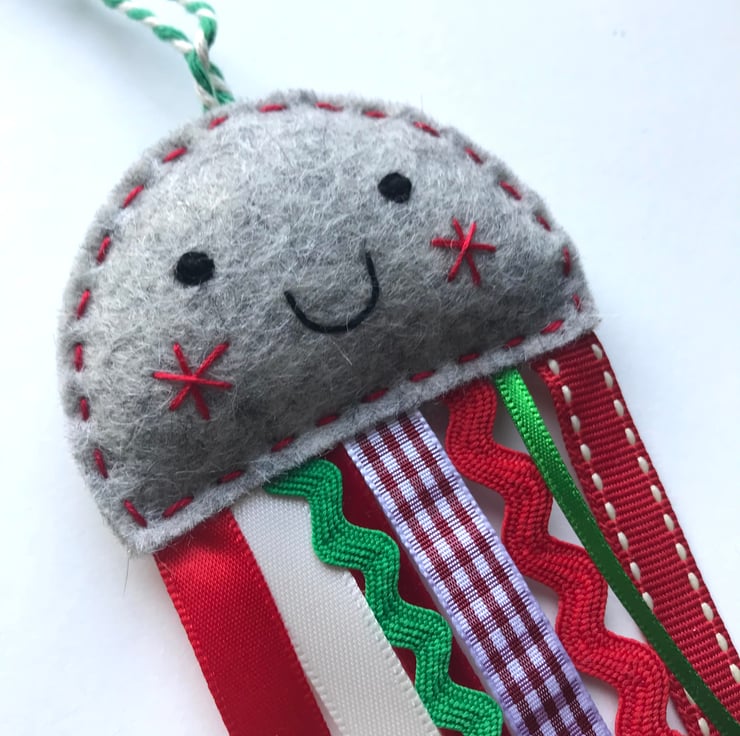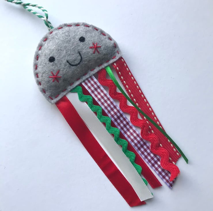 Hand made from wool felt, ribbons and scrap yarn stuffing, a jellyfish will make a cheery and alternative Christmas tree decoration. The ribbon tentacles are carefully selected for a festive feel. Each jellyfish is unique due to the different ribbons and hand stitching. The face is hand embroidered and the whole jellyfish is hand stitched together. The ends of the ribbons are sealed so they will not fray.