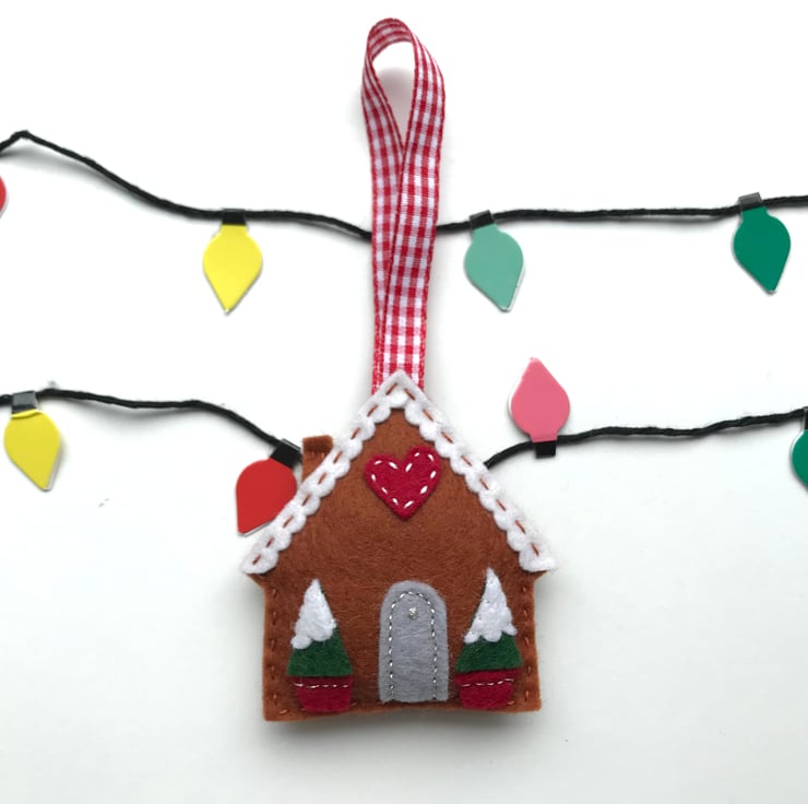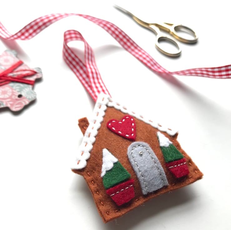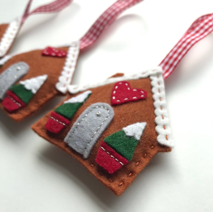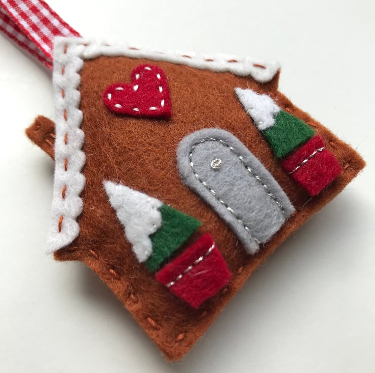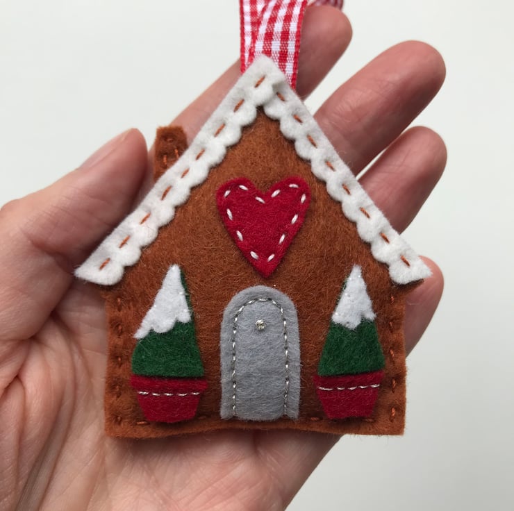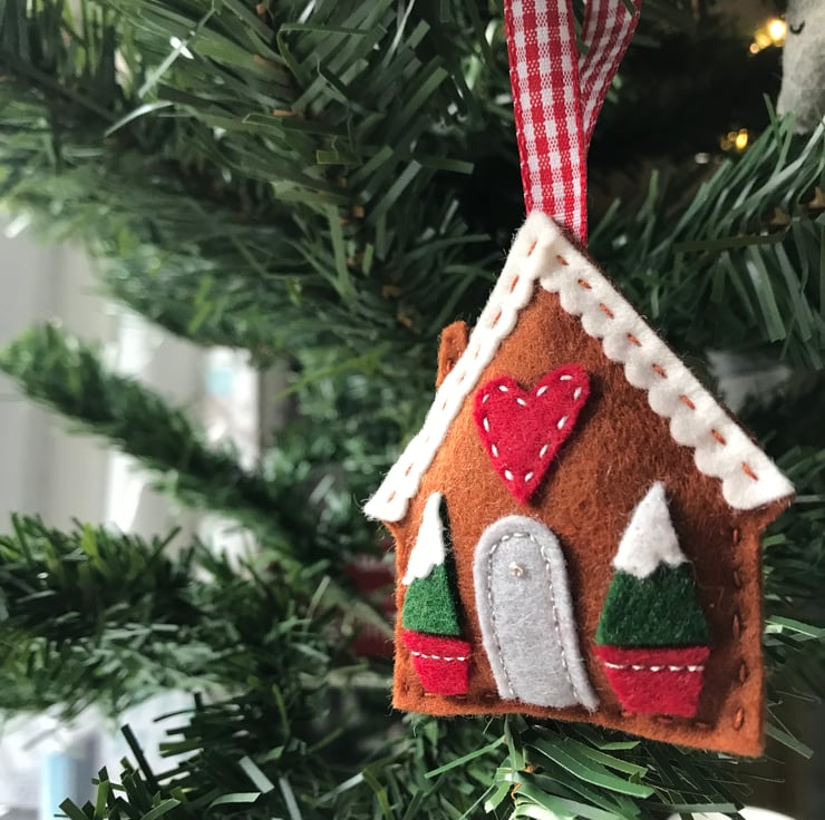 The gingerbread house is made from 100% wool felt, which is soft and strong. The details such as doors and the snowy roof are added with appliqué and hand stitched into place with embroidery thread. The house hangs from a red checked ribbon. A small appliqué heart is the finishing touch, making this tree decoration a sweet gift for a loved one.