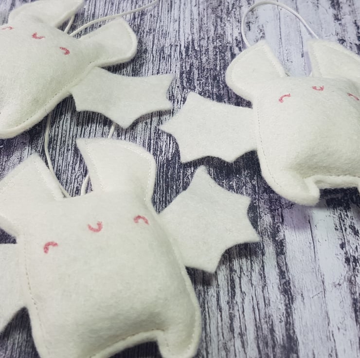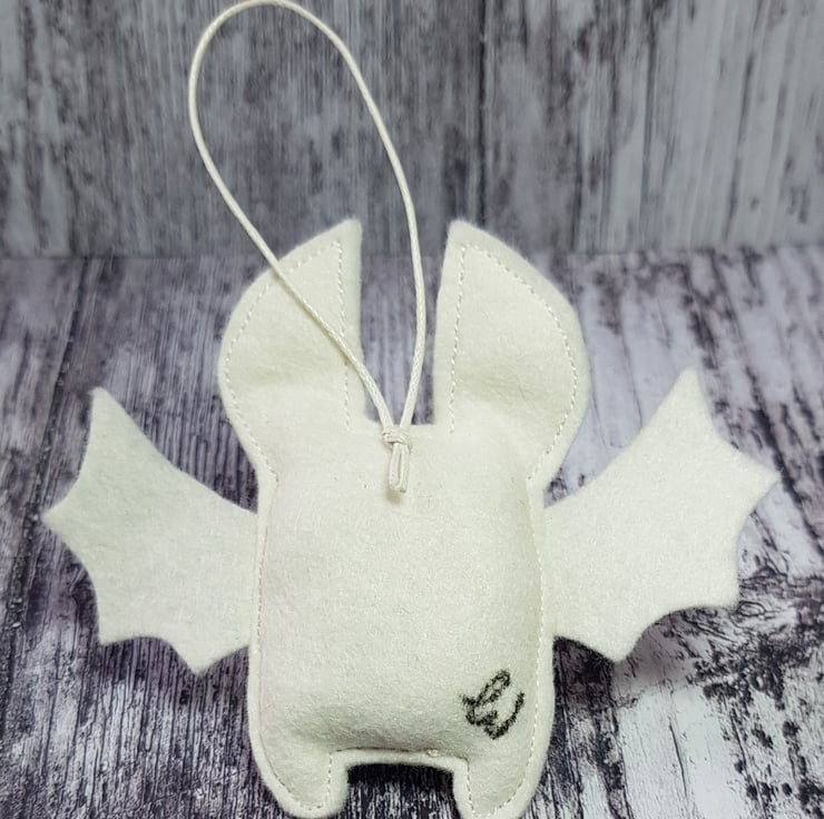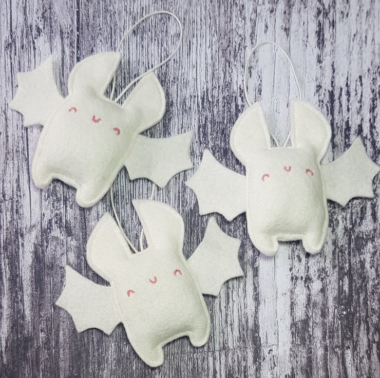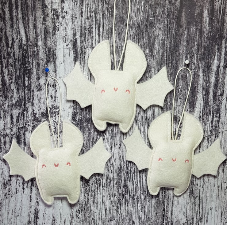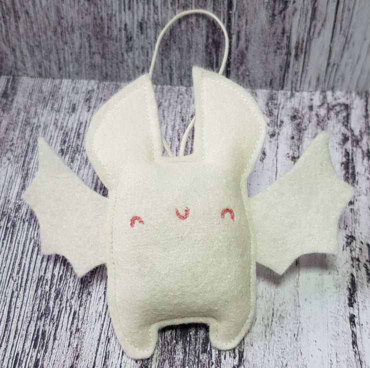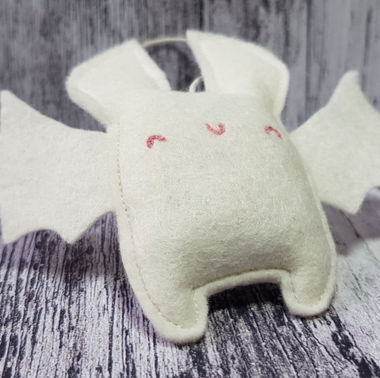 These cute felt albino bats have free motion embroidered details in pink with a wax thread hanger attached and raw edging. They're my own design and are super soft. Measures roughly 8.5cm tall and 10.5cm from wing tip to wing tip. My Wubsys 'W' is signed on the back. This listing is for one bat. Sent in recyclable packaging. This is for decorative purposes only and not a toy. Spot clean only.