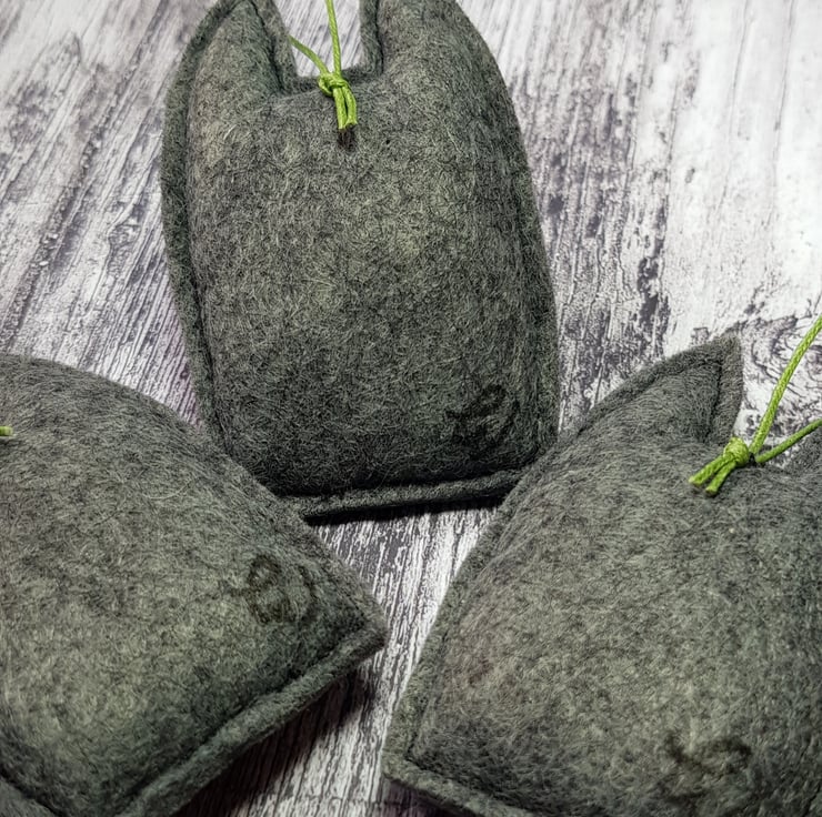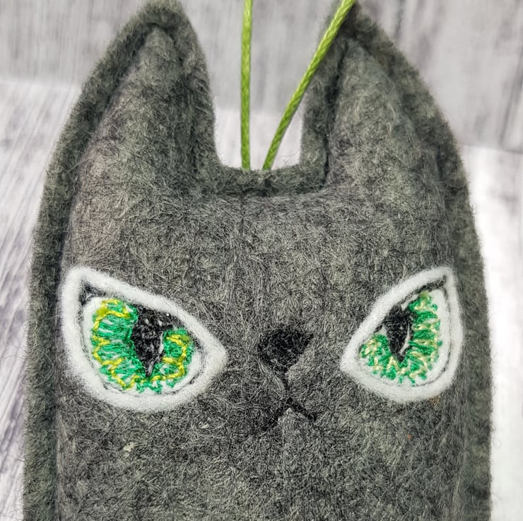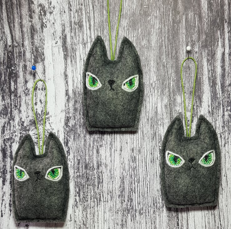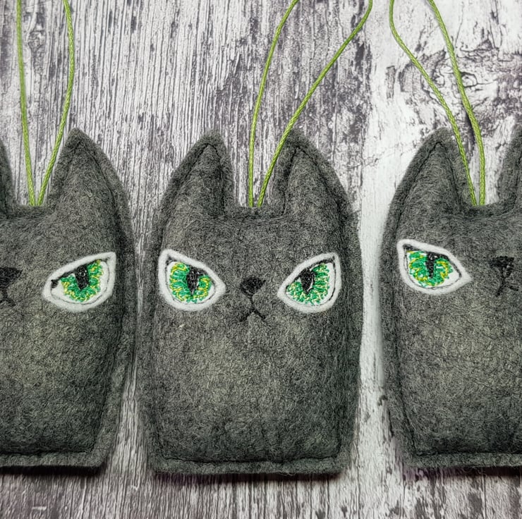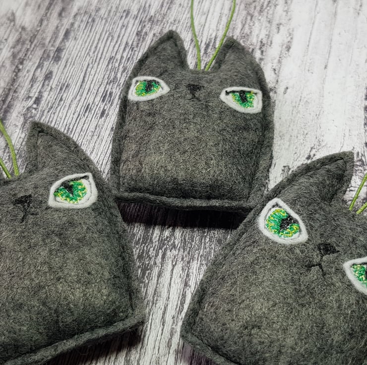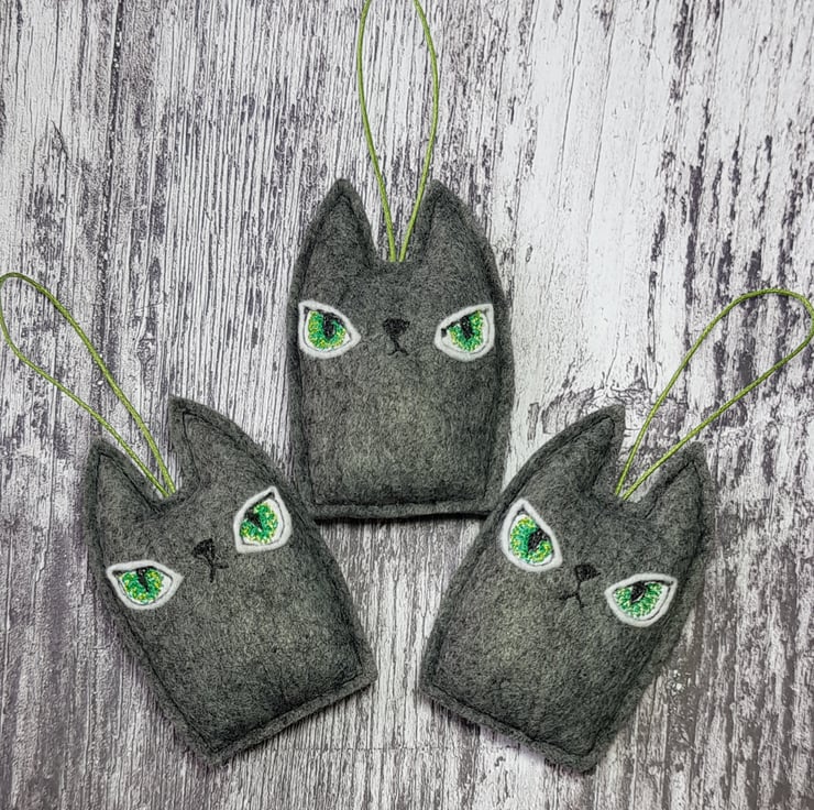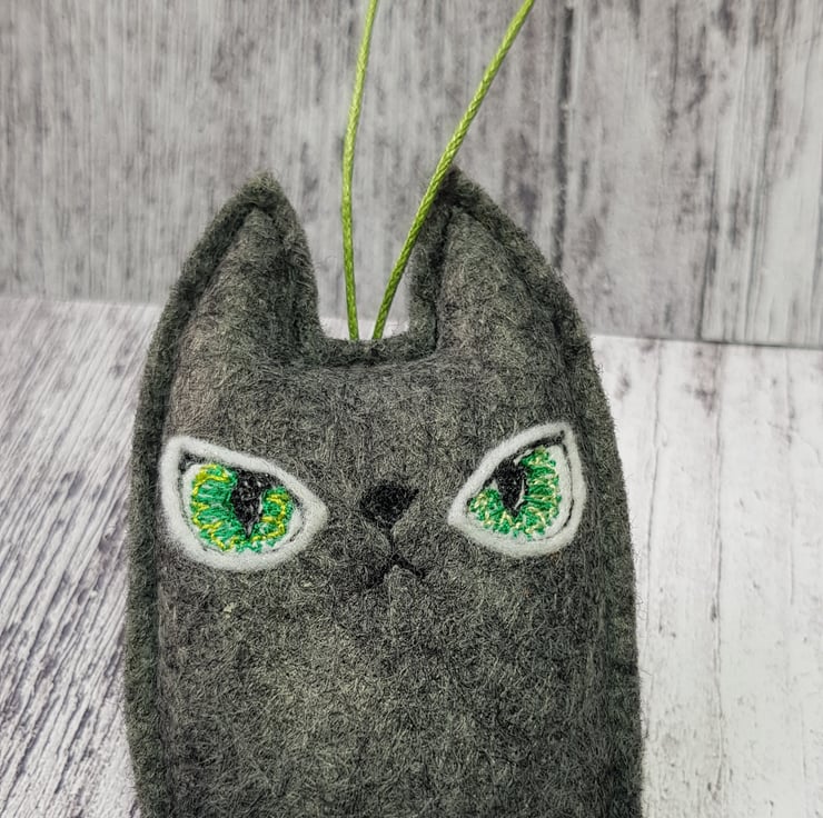 These cats are made from soft marl charcoal felt. They have free motion embroidered felt eyes using multiple greens and hang from a green wax thread. They measure roughly 8cm tall and 4.5cm wide, are gently stuffed and come with the Wubsys 'W' signed at the back. This listing is for one cat. Sent in recyclable packaging. This is for decorative purposes only and not a toy. Spot clean only.