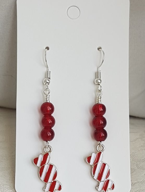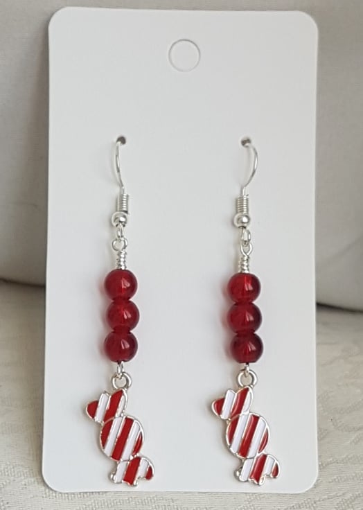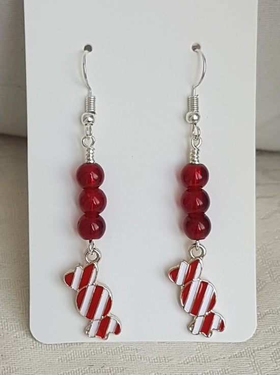 Trick or Treat Red and White Striped Candy Earrings. Gorgeous Candy shaped charms and fabulous red crackle beads.A lovely treat for Halloween, or as a sweet gift.