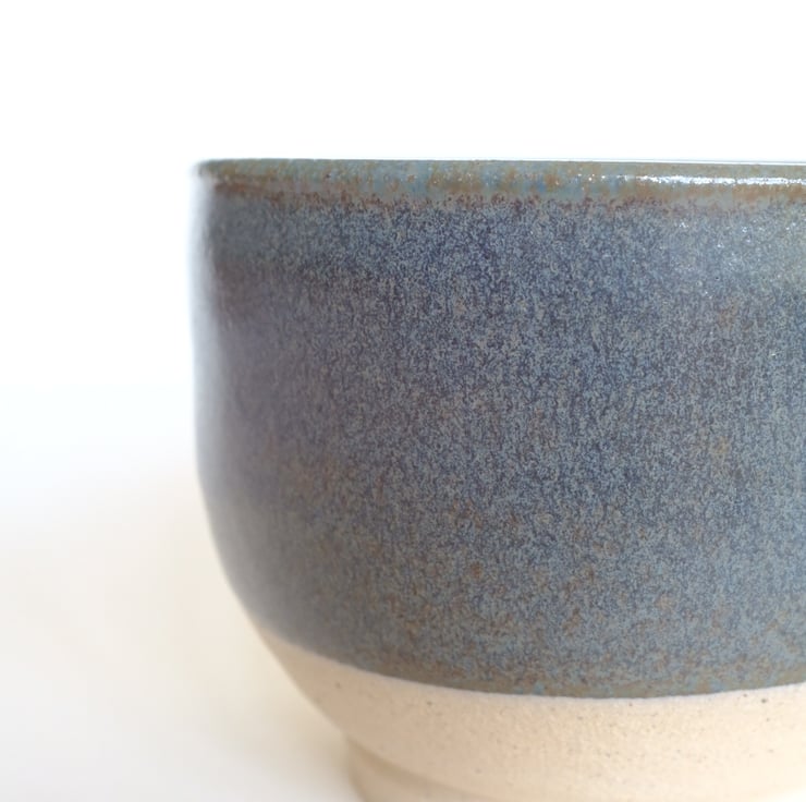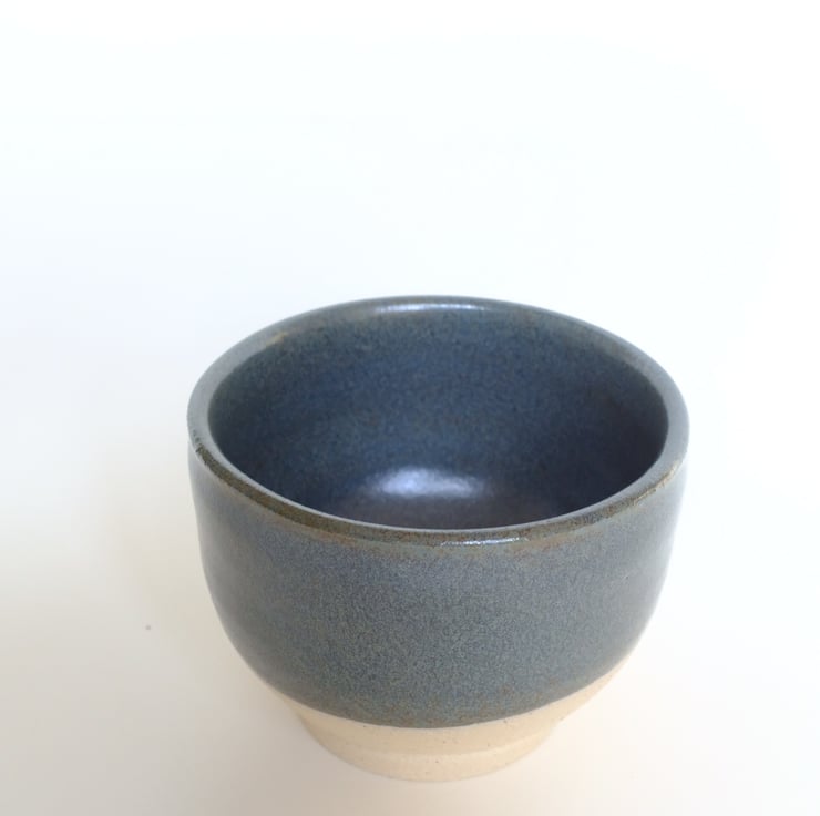 Small, stoneware bowl, glazed with dark blue glaze. Good as a decorative piece, or as a bowl for nibbles. Height: 8cm. Diameter: 9.5cm. Base diameter: 6.5cm.
