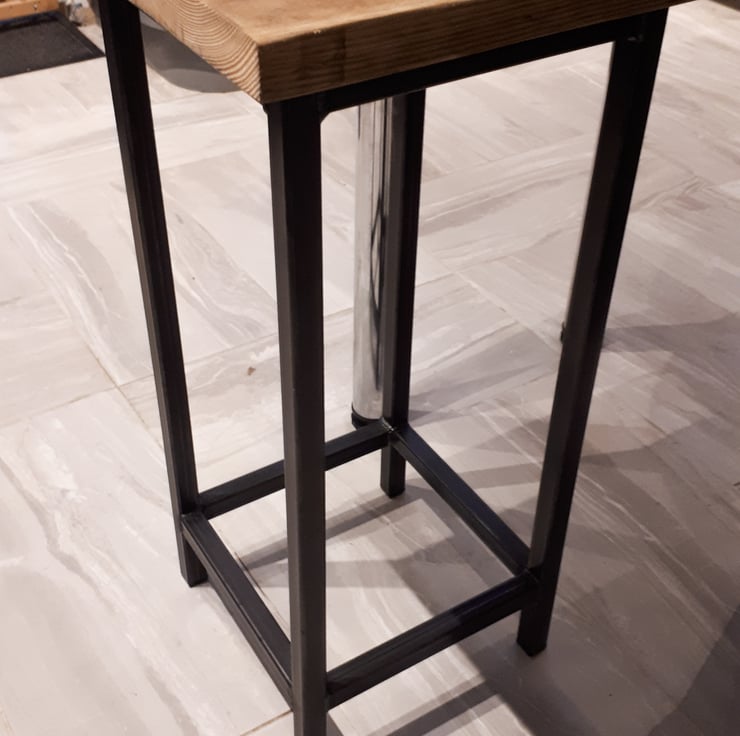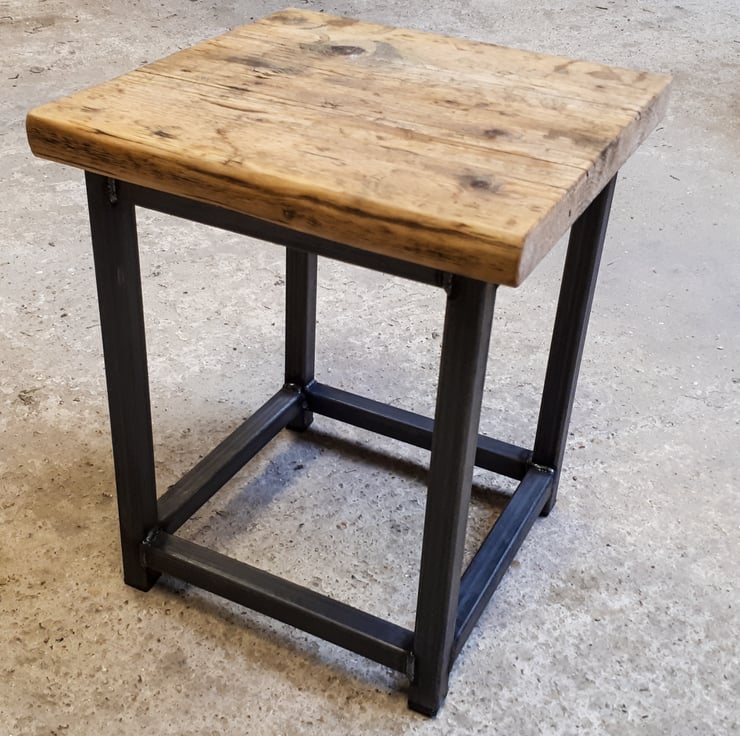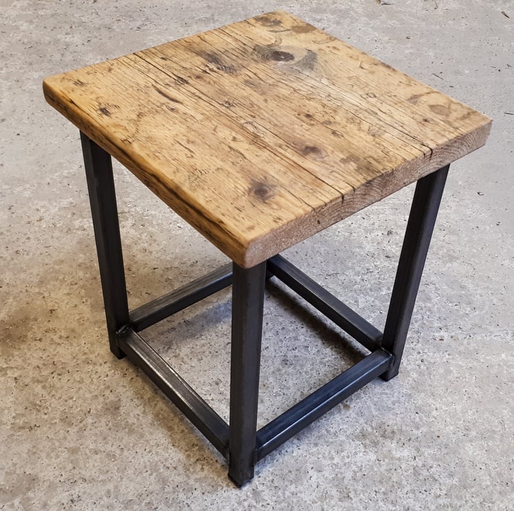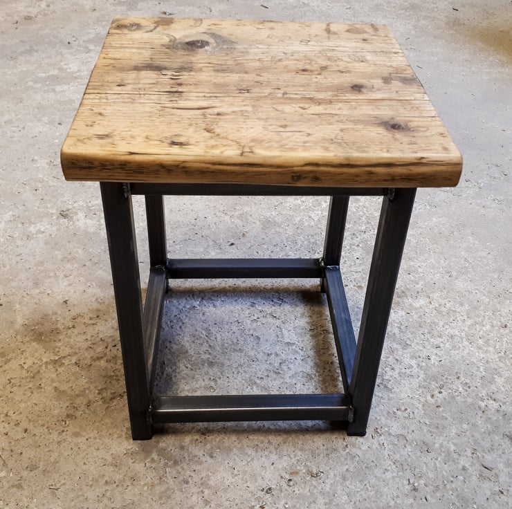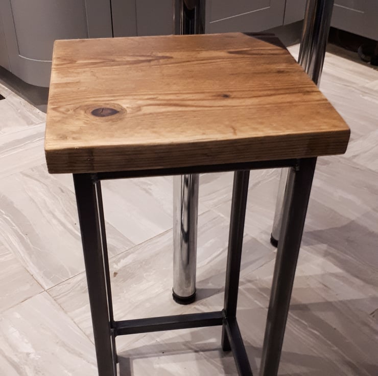 Industrial look simple stool made from 25mm square box section steel with reclaimed scaffold board top.