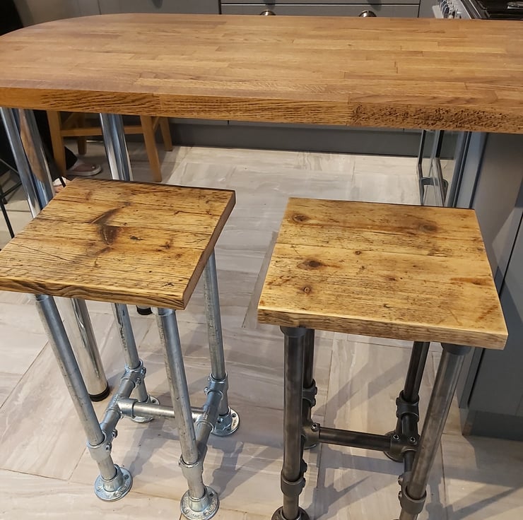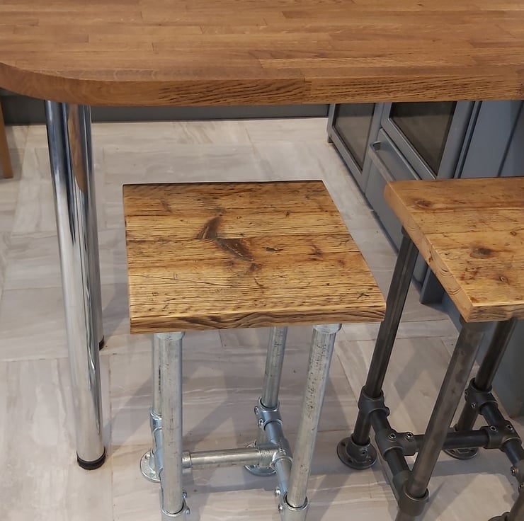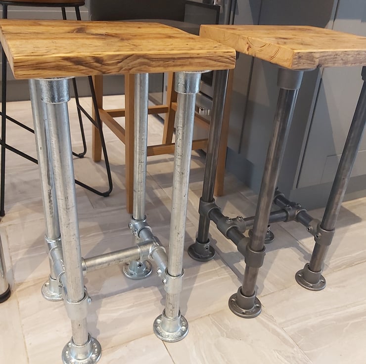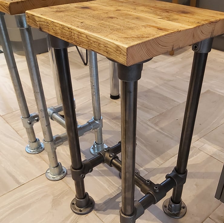 Industrial look simple stool made from scaffold tube and fixings with a reclaimed scaffold board top.