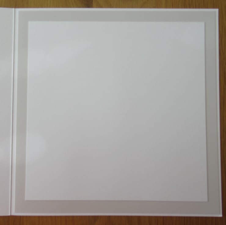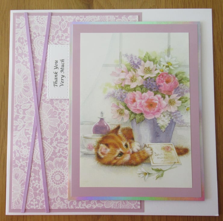 This pretty 8x8 inch card in lilac tones features a kitten and a vase of flowers. It has several layers and a double ribbon down one side of the card. The image has a silver mat and is mounted on 3D foam for that luxury feeling as is the greeting. The inside of the card coordinates with the front but has no message.