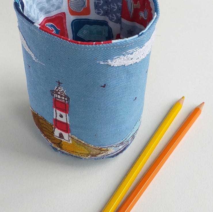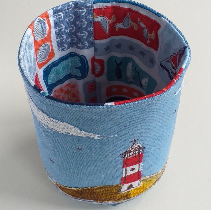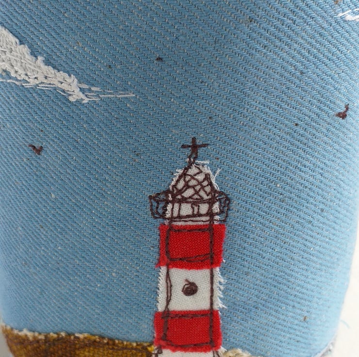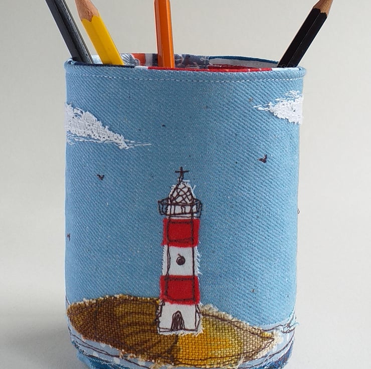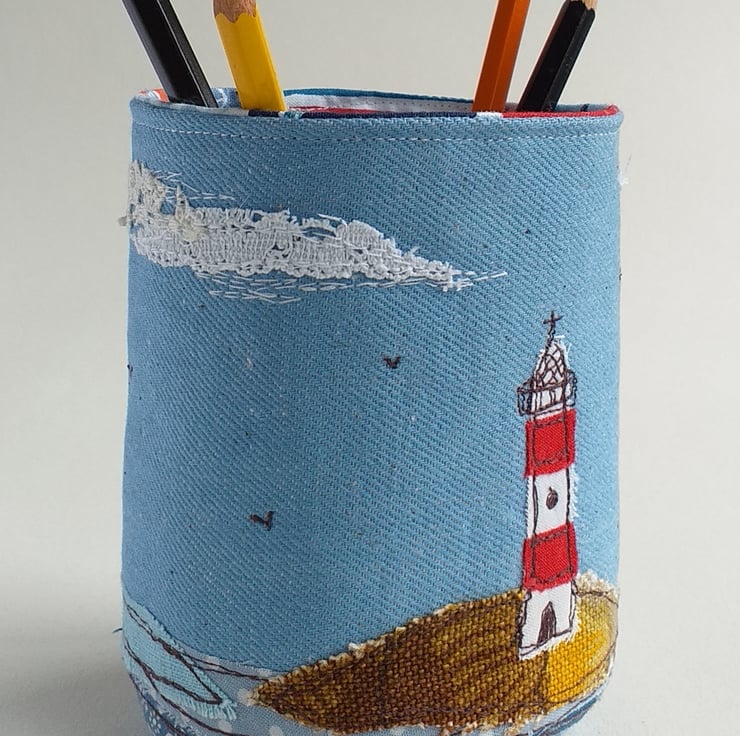 This unusual pencil pot is made out of stiffened blue canvas with a cotton lining. It features a lighthouse scene in freestyle machine embroidery using fabric scraps and thread.