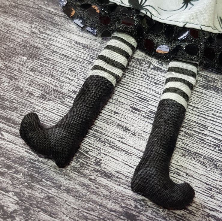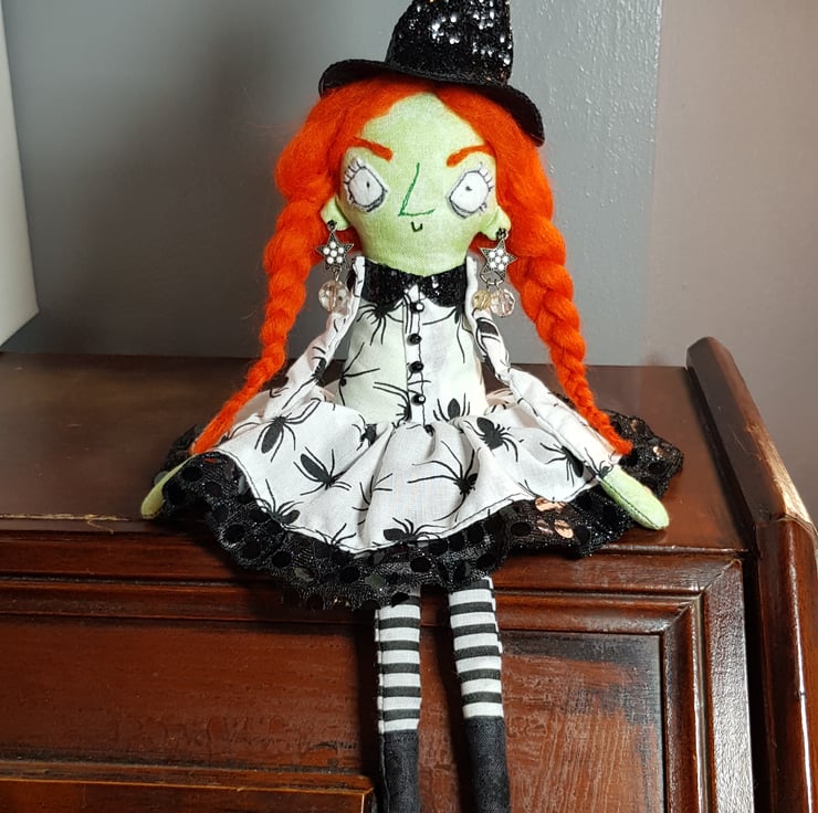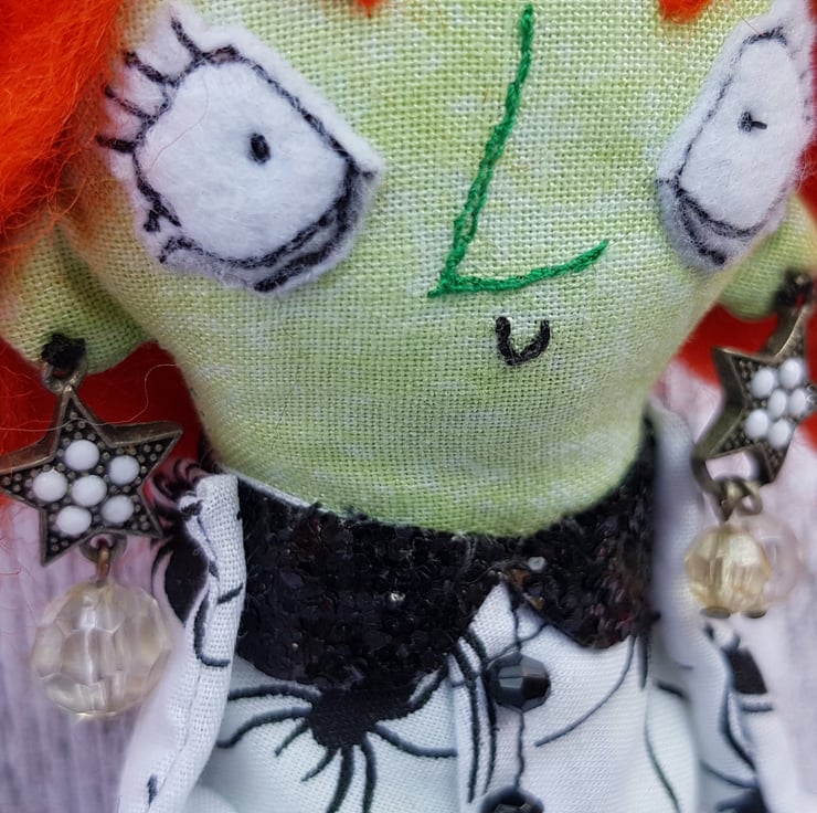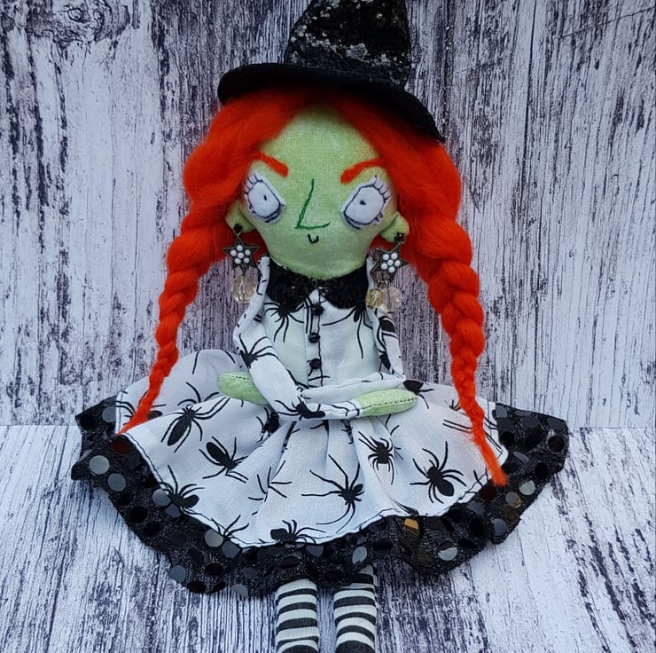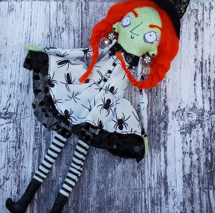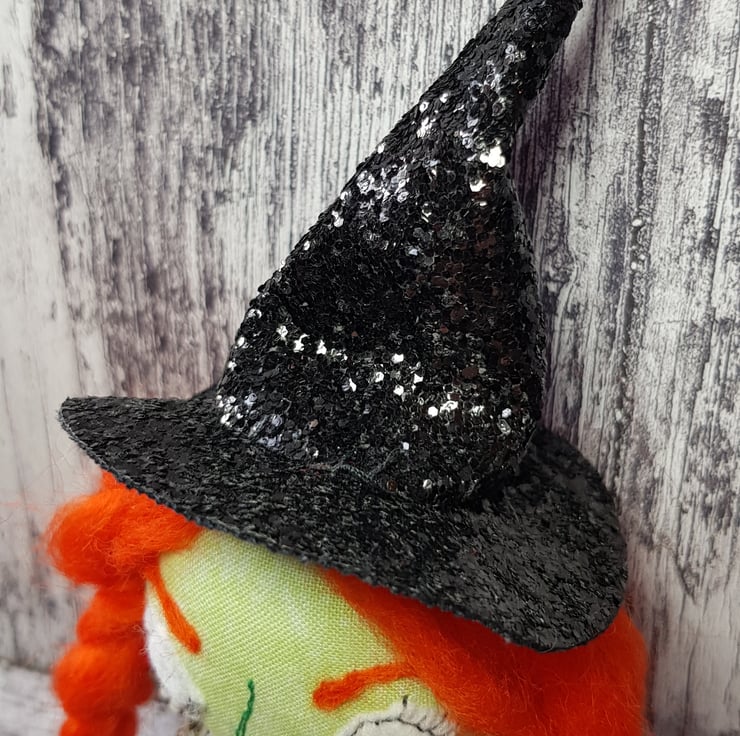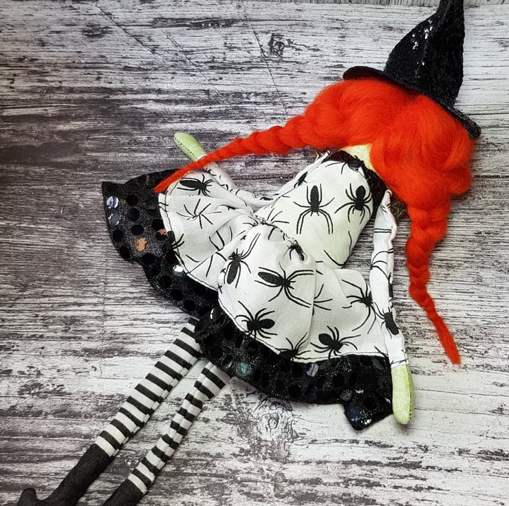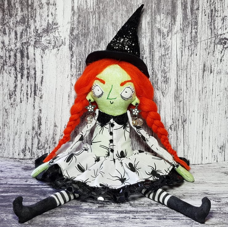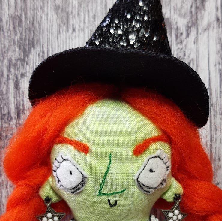 This fiery witch has hand dyed hair needle felted into style and braided. Her crooked hat is made from black glitter fabric, as are her matching collars. Beatrix wears upcycled beaded star earings and her dress top has upcycled faceted bead buttons. Her legs and arms are un-stuffed and so easily posed. Her boots and hands are stuffed to add a little weight for dangling. With some coaxing, Beatrix can sit unaided, helped by her full skirt with sequined tulle trim. Her clothes and hat are sewn into place so are not removable, as are her lacy knickers. Her face is free motion embroidered and her eyebrows are needlefelted. Beatrix measures roughly 33cm tall and comes sent in recyclable packaging. This is meant for decorative purposes only and is not a toy. Spot clean only.