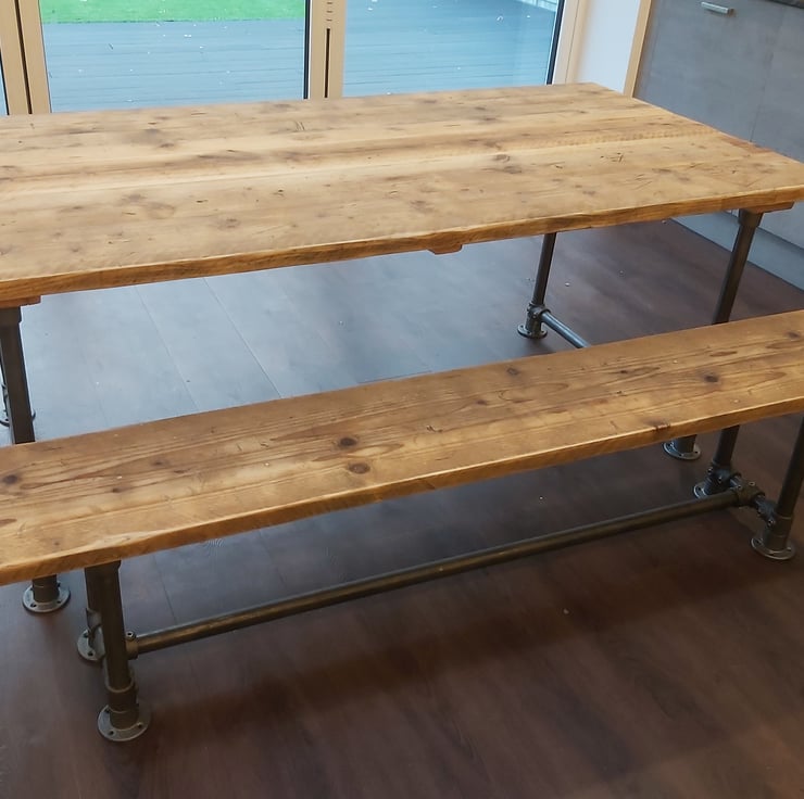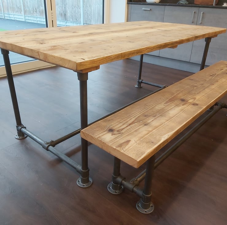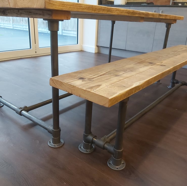 Industrial look bench made from scaffold tube and fixings with a reclaimed scaffold board top.