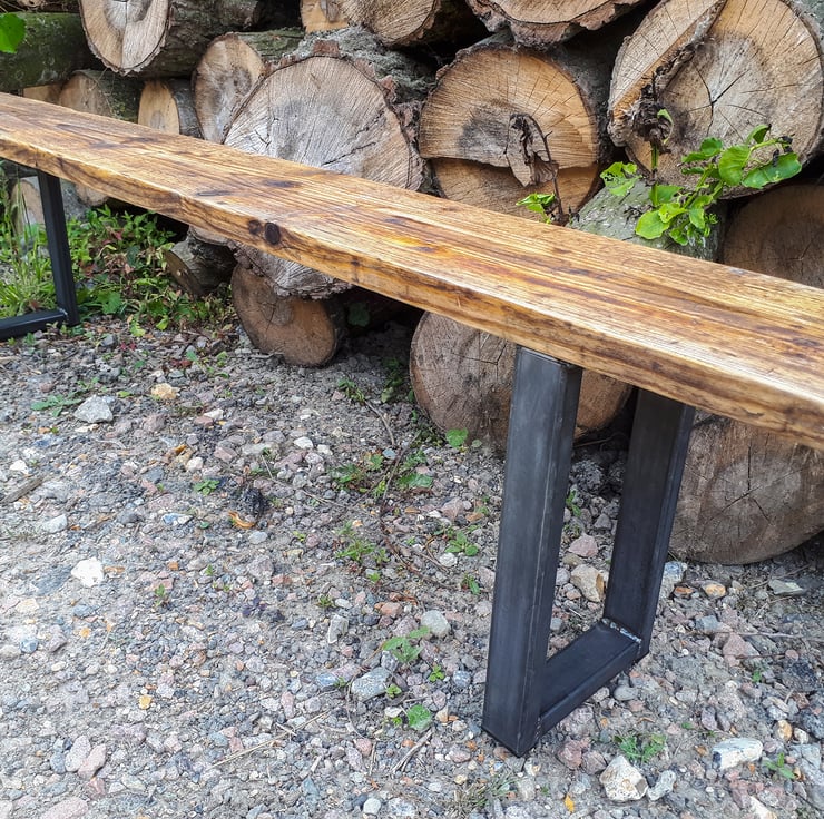 Reclaimed scaffold board bench beautifully proportioned with 50x25mm steel box section legs.