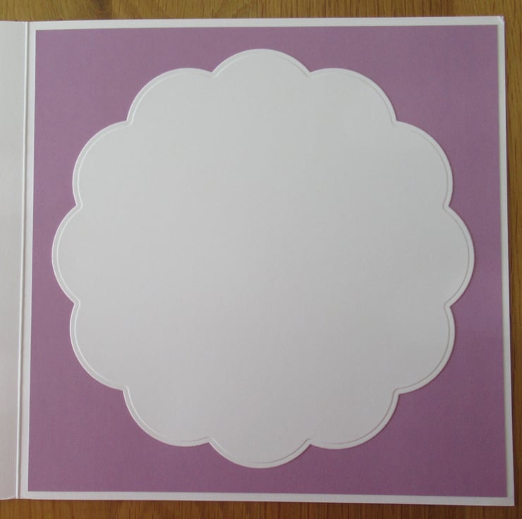 This pretty 8x8 inch card features postcards with flowers and has a white and silver organza ribbon threaded through a heart shaped embellishment along the bottom. One of the postcards and the Thank You message are mounted with 3D foam. The inside of the card is finished to match the front but there is no message.