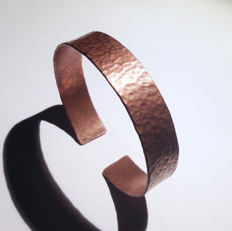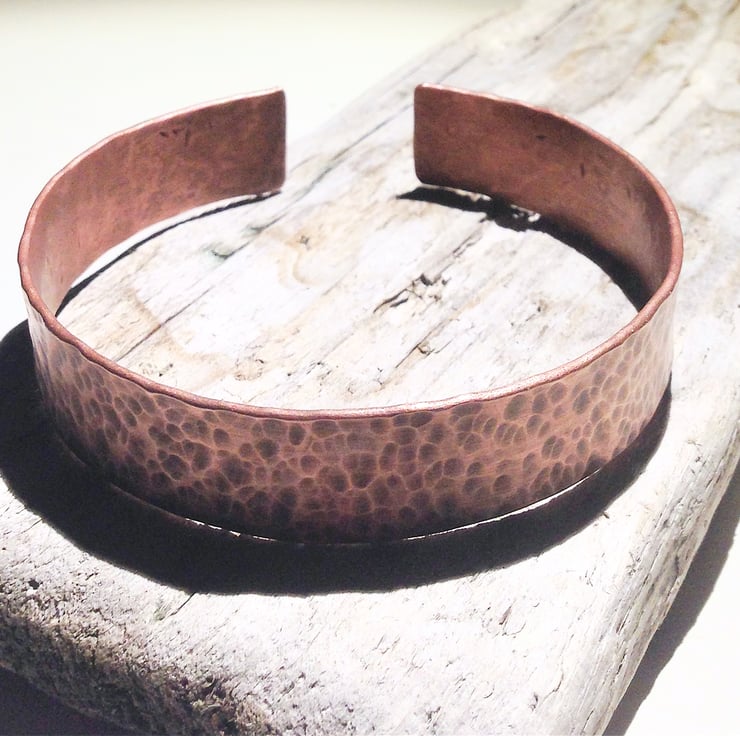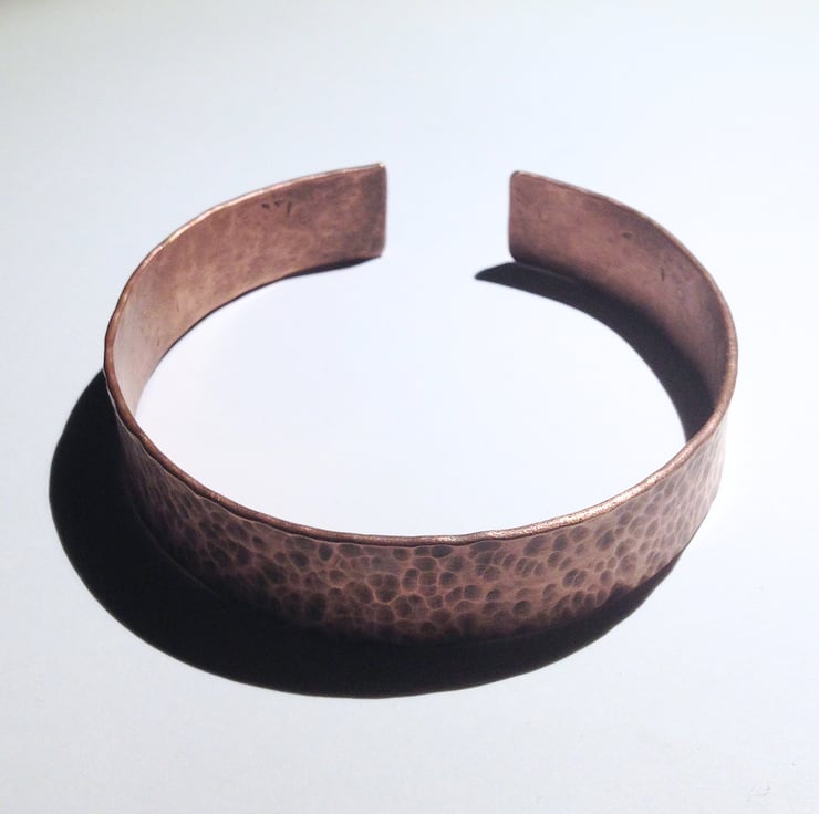 This cuff bracelet is hand made from copper piping which has been given an interesting ball hammered finish. It has been polished then lightly oxidised and rubbed back