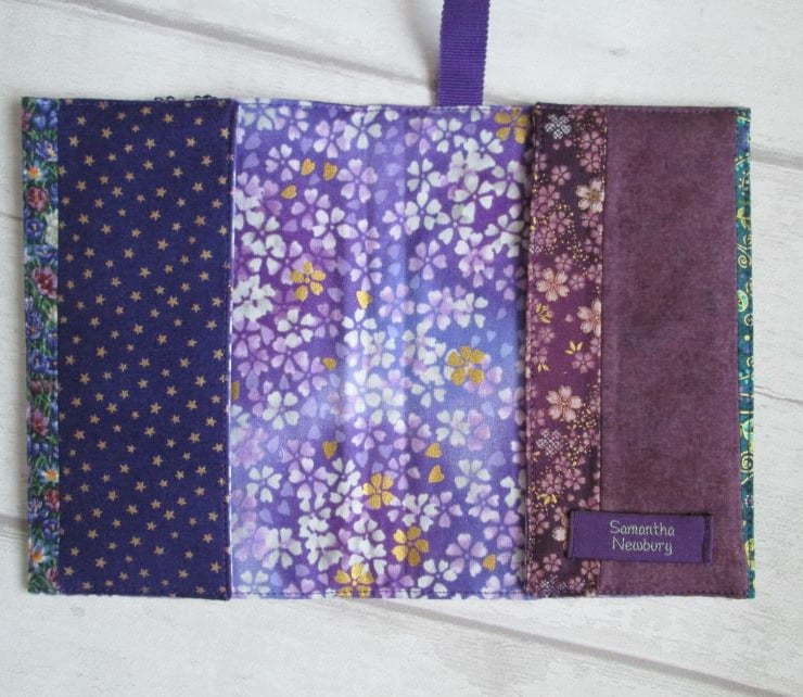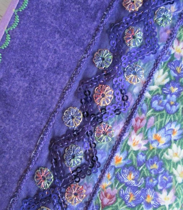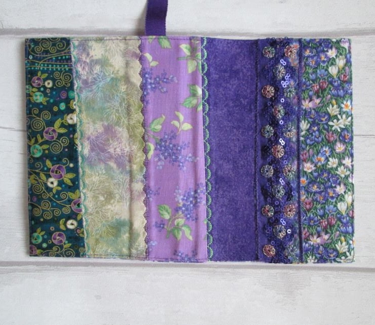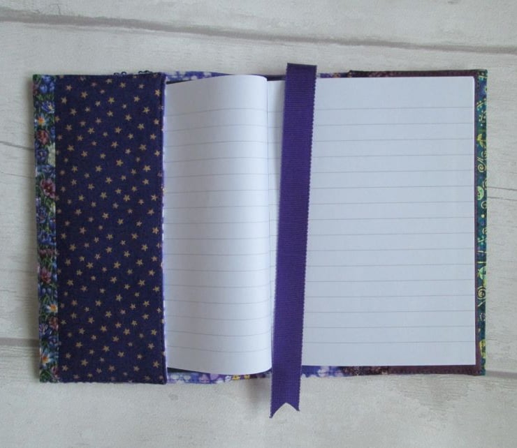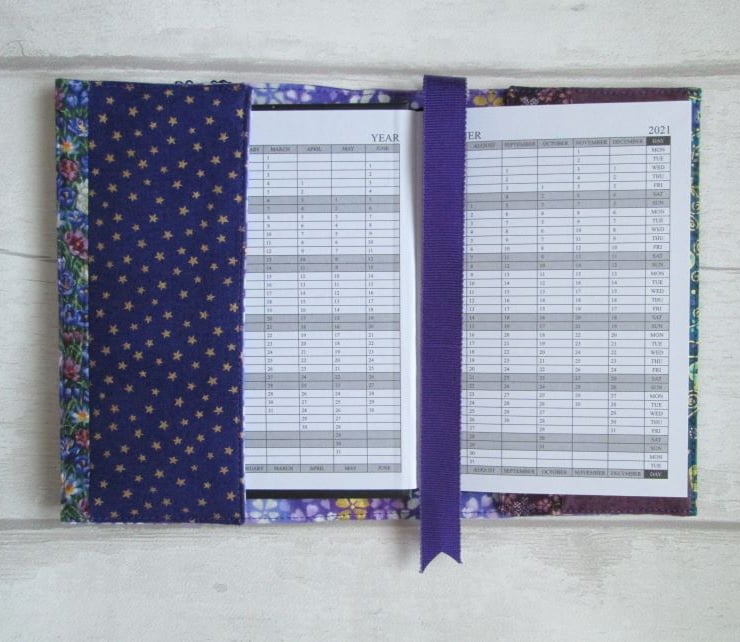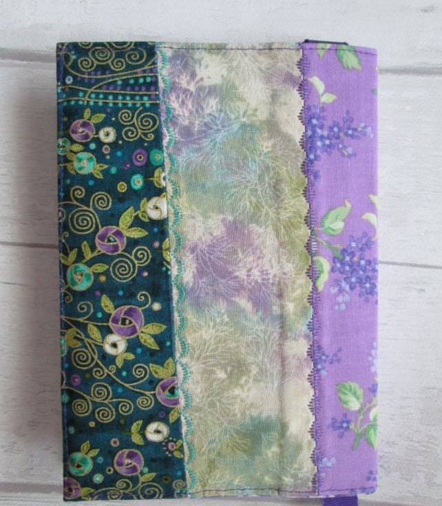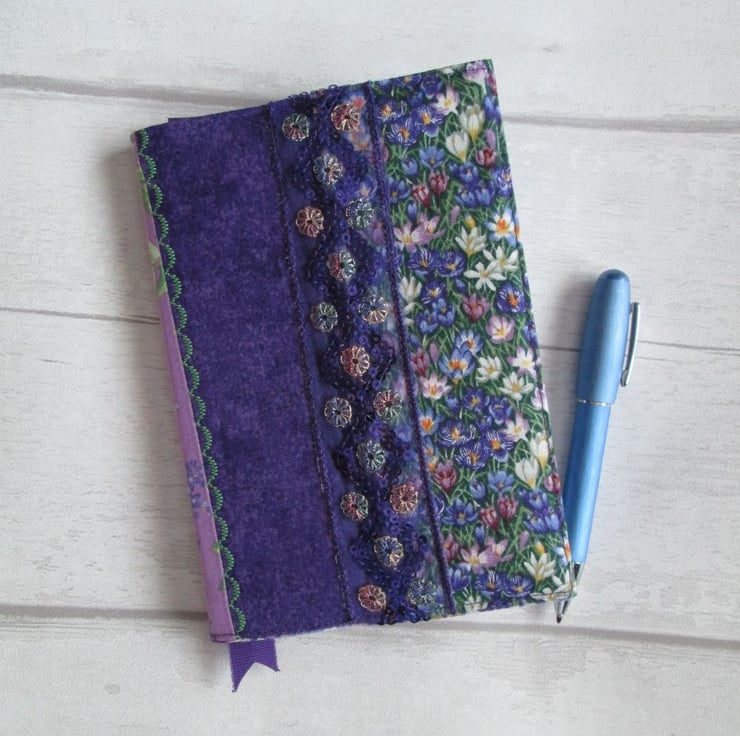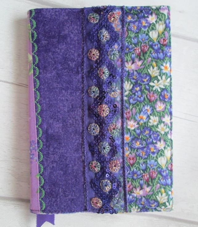 A pretty notebook or diary cover made from a coordinating selection of prints in shades of plum, purple and green. Crocus, lilac and other flowers all feature along with some shimmery sequined ribbon and machine embroidery. Complete with your choice of either a lined notebook or, for an additional £1.00, a week to view diary.