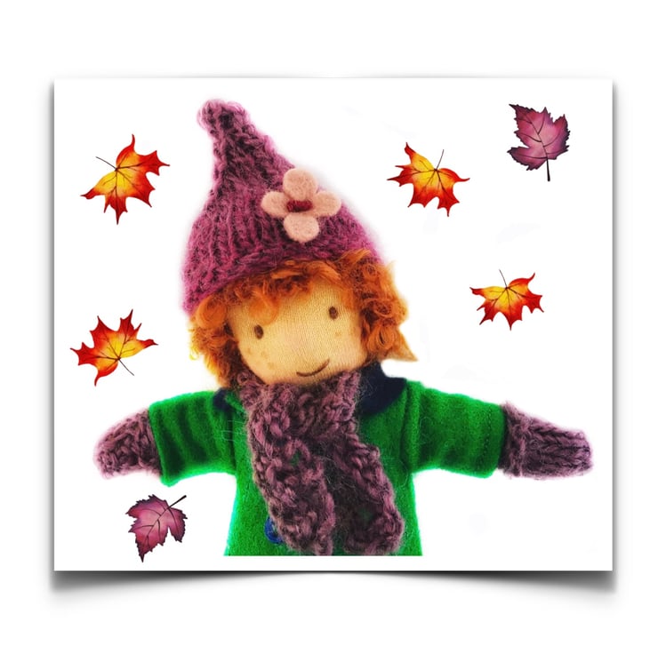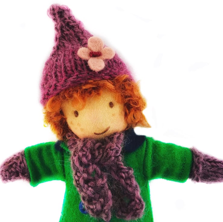 A cute little handknitted hat, scarf and mittens set to fit the Little Hugs dolls. The set is knitted from lovely shaded wool and is just the thing to keep little hands and heads warm now Autumn is coming and there is a nip in the air. The mittens are on a crocheted chain so that Maisy and her friends don’t lose them.