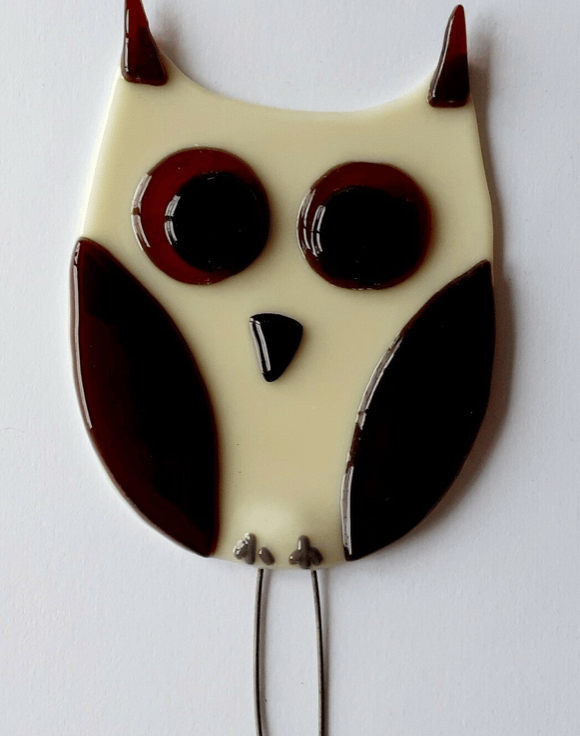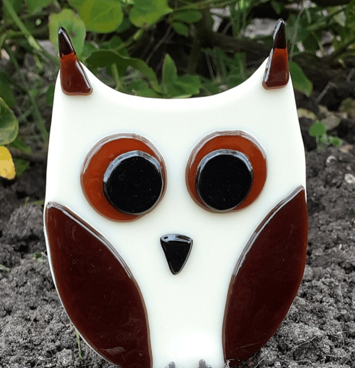 It has two sturdy nichrome wire leg stakes to insert into the earth, and which won't rust. This owl has a cream body and the wings and long ear tufts have been cut from a piece of dark amber glass. It measures 10cm high x 8.5cm approx.