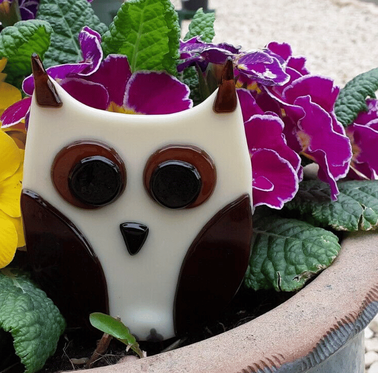 This cute little fused glass owl is designed to sit in a plant pot or a sheltered corner of the garden, and will happily sit outside all year round in a sheltered spot, or be equally at home in an indoor plant pot.