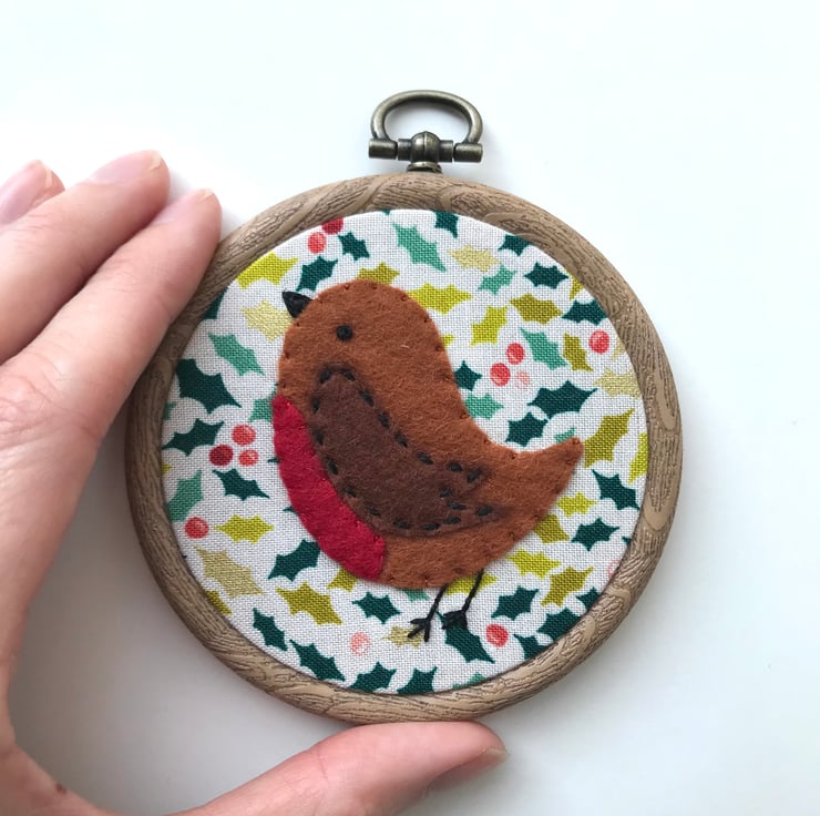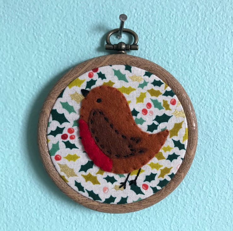 Robins are an intrinsic part of Christmas tradition, and my appliqué robin decoration is one of may favourite decorations to make. Each robin is made from wool felt, and hand stitched into place on festive printed cotton. The appliqué is then framed in an embroidery hoop, this hoop is a wood grain effect plastic hoop.