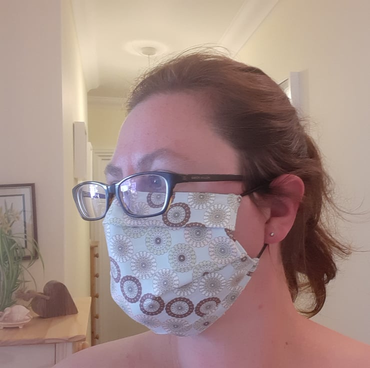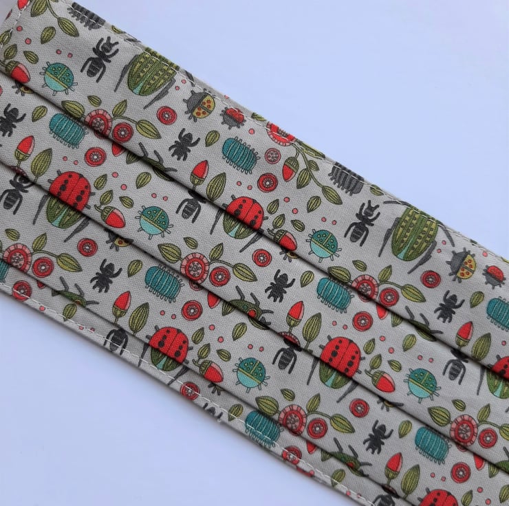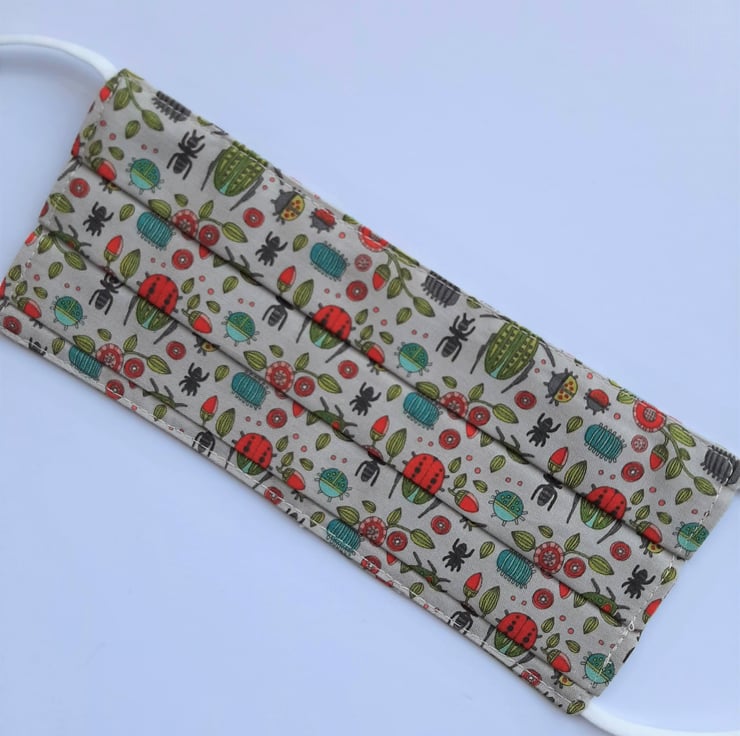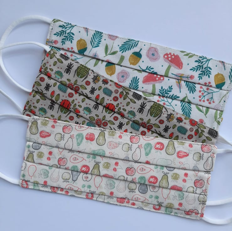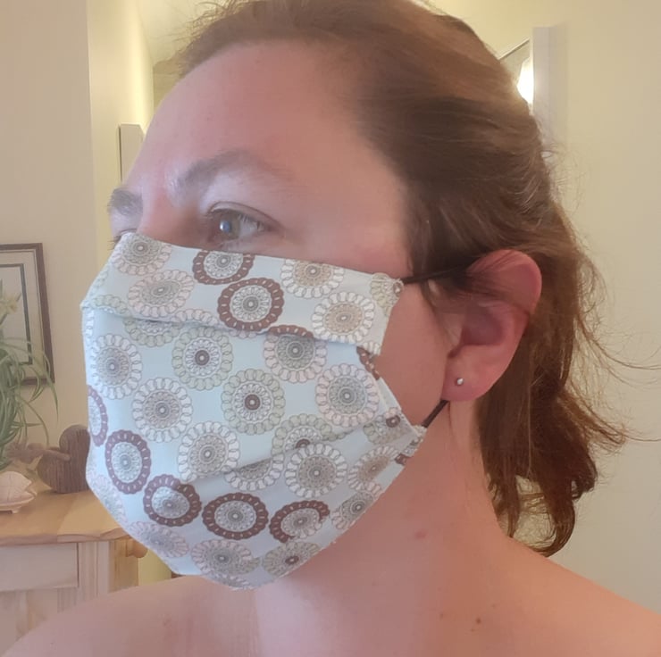 A washable fabric face covering made from two layers of good quality quilting cotton. These are a medium sized pleated face covering with soft elastic ear loops.