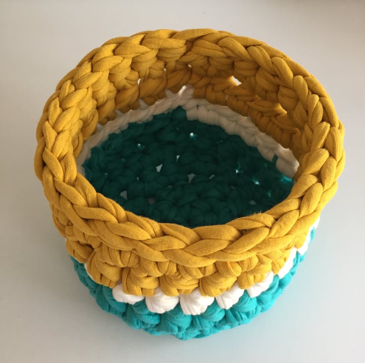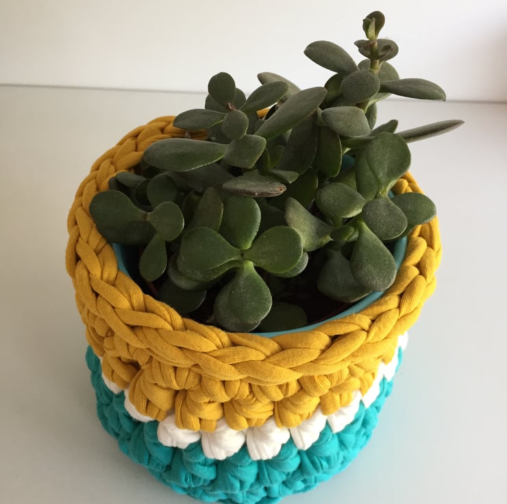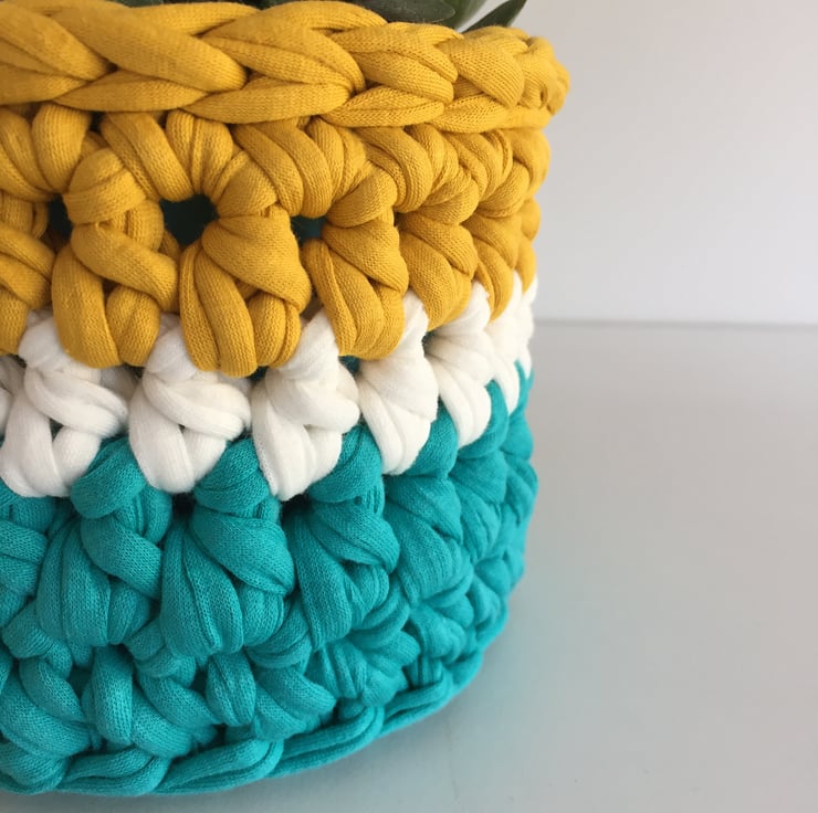 Made with sturdy upcycled textile yarn in bright and colourful shades of turquoise, white and mustard yellow, the basket is approx 11cm diameter and 11cm tall. It is designed to accommodate a standard 10cm plant pot but will stretch slightly to fit different shapes.
