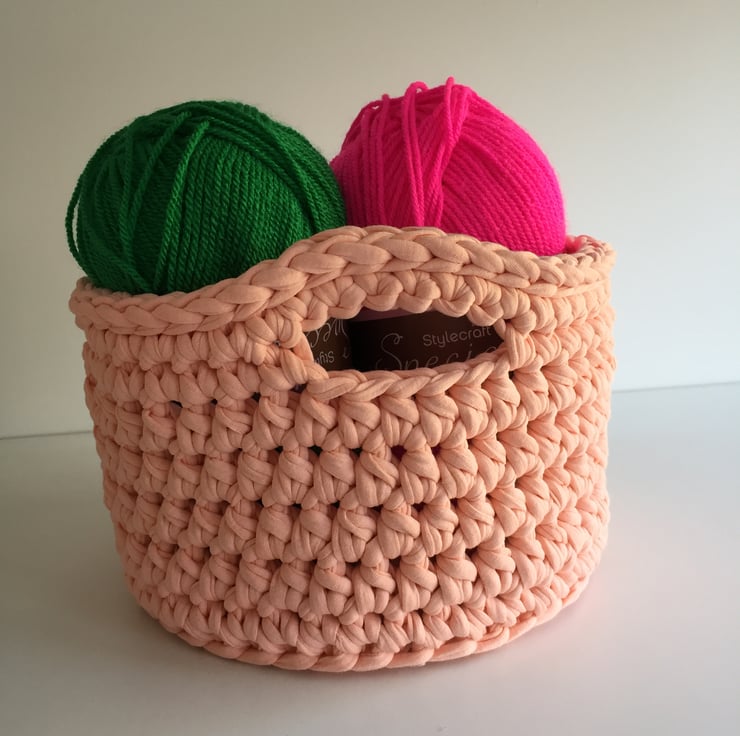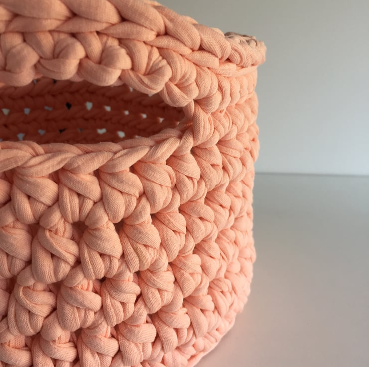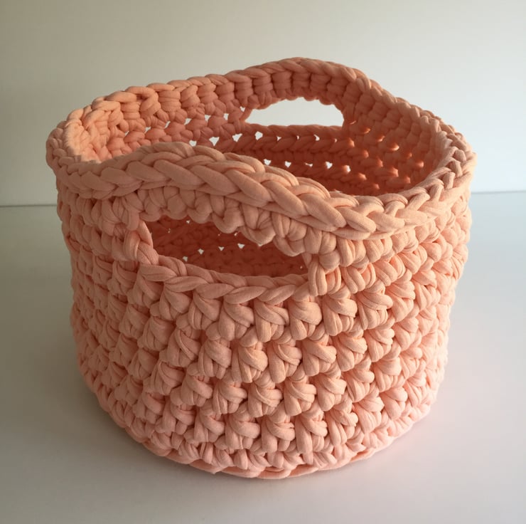 Made with sturdy upcycled textile yarn in a pretty shade of peachy pink, the basket is approx 22cm diameter and 15cm tall. It has two handles which make it easy to carry it around with you.