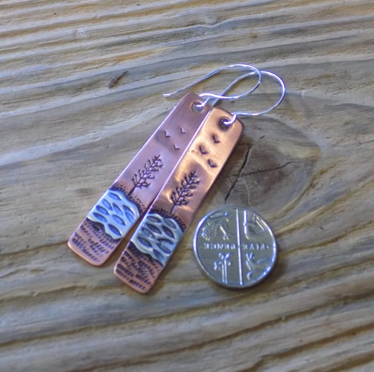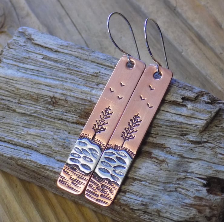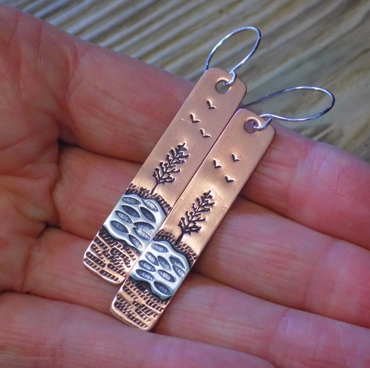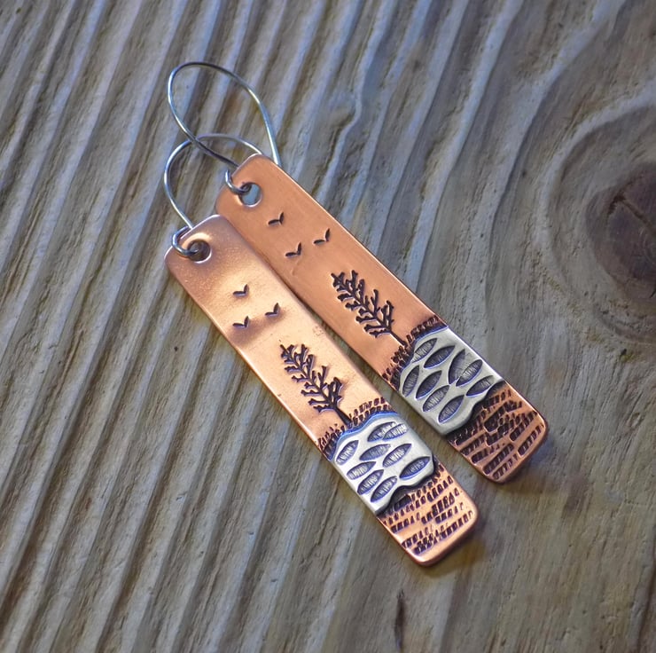 Made from Copper and and sterling silver sheet. The silver has been carefully soldered to the copper and textured with a punch to give the impression of leaves. More texture and a tree have been added with the addition of a small flock of birds. Simply hung on my hand made 0.7 mm sterling silver ear wires.