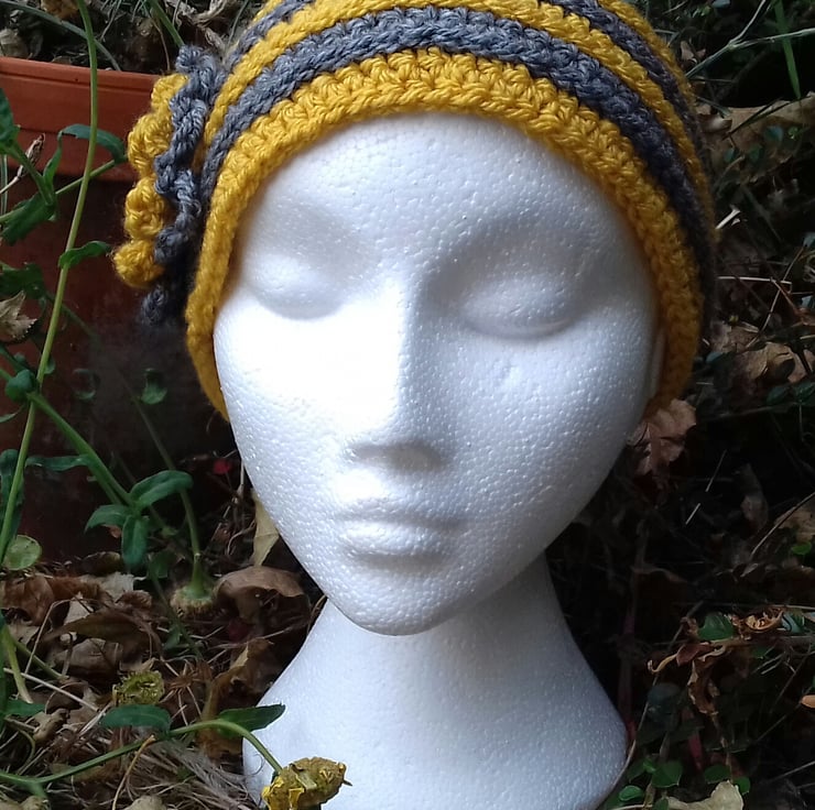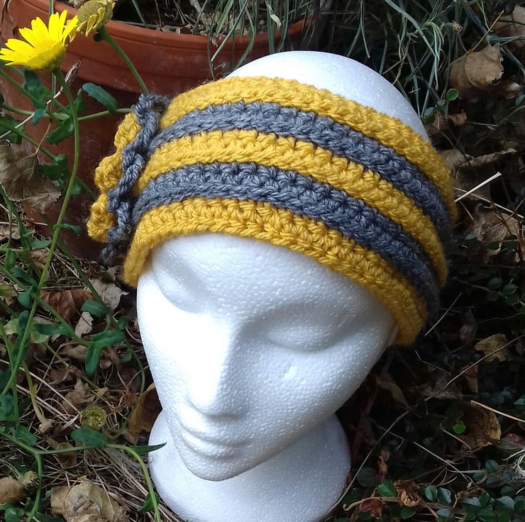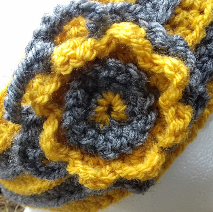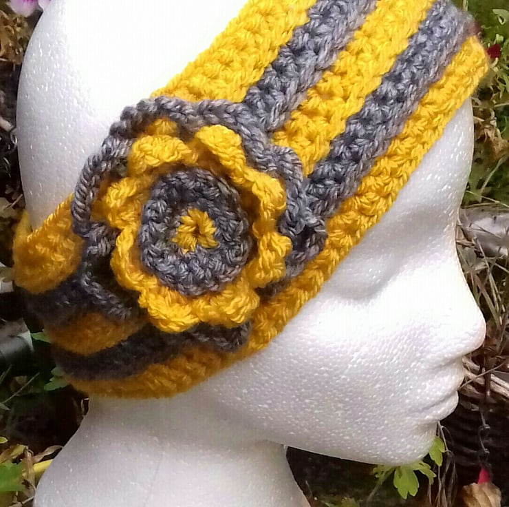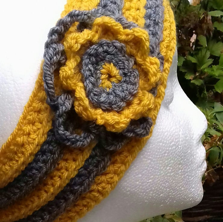 Alternate mustard and grey bands with the addition of a matching 3 layered flower