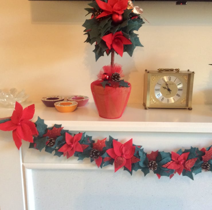 Decorated with (hand cut) felt holly, pine cones, artificial berries and other decorations. Everything on it is everlasting.