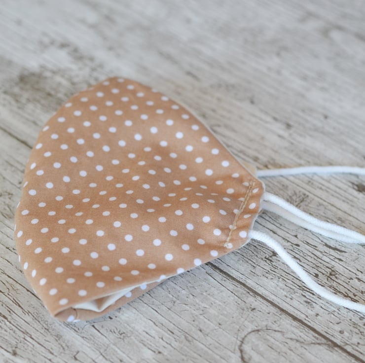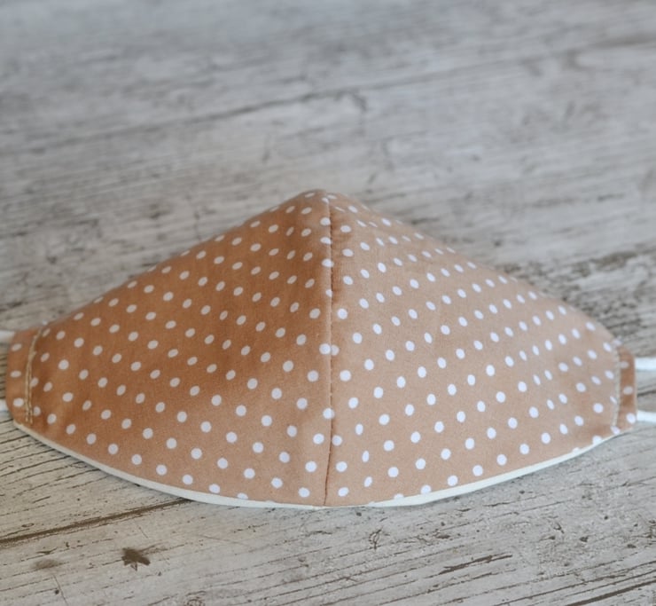 Was £5.99 Mocha polka dot 100% Cotton face mask. It has a cream Rose and Hubble fabric lining so that you know which way to wear it. Soft elastic which doesn't hurt the ears.