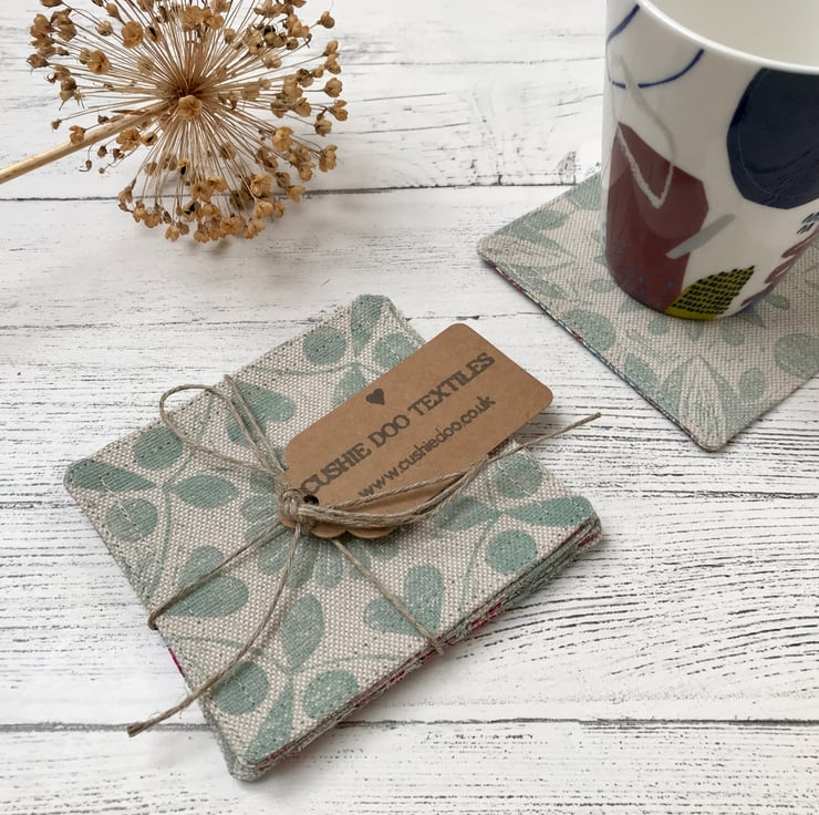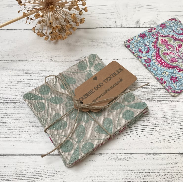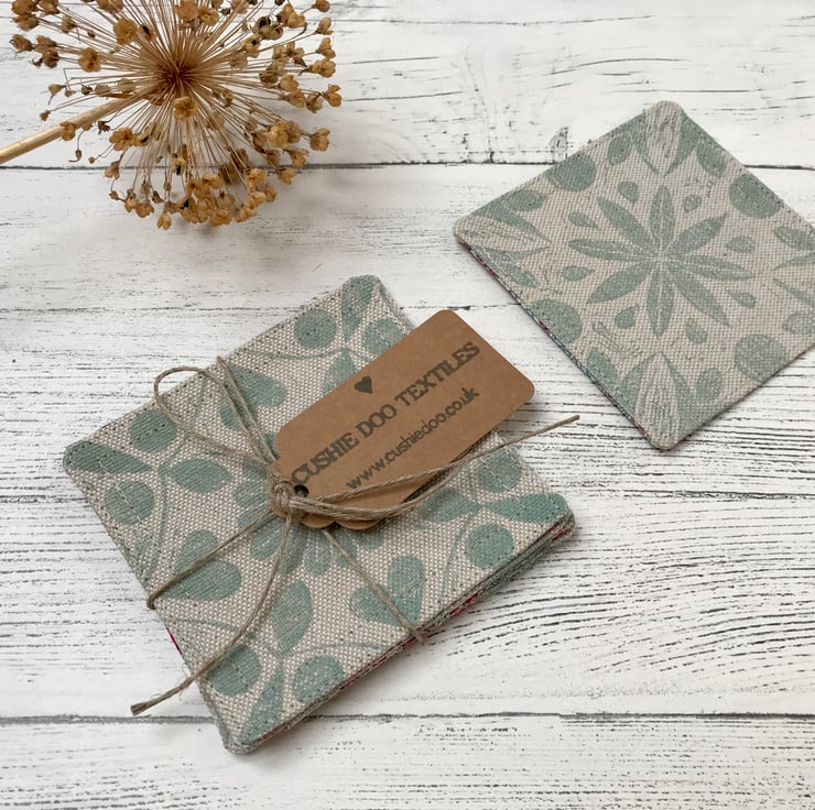 A lovely set of 4 hand printed Linen Coasters, 2 each of 2 different designs. These are perfect to protect your surfaces from hot or cold drinks