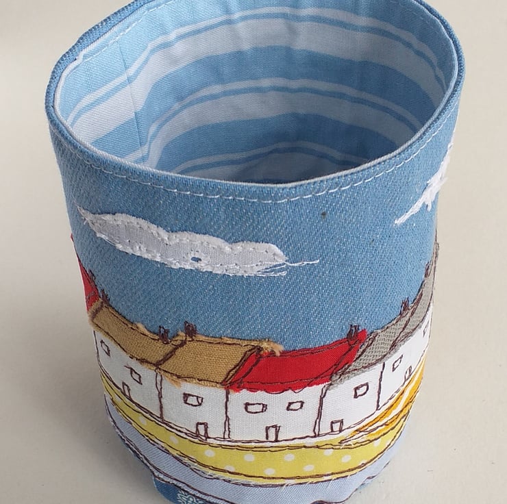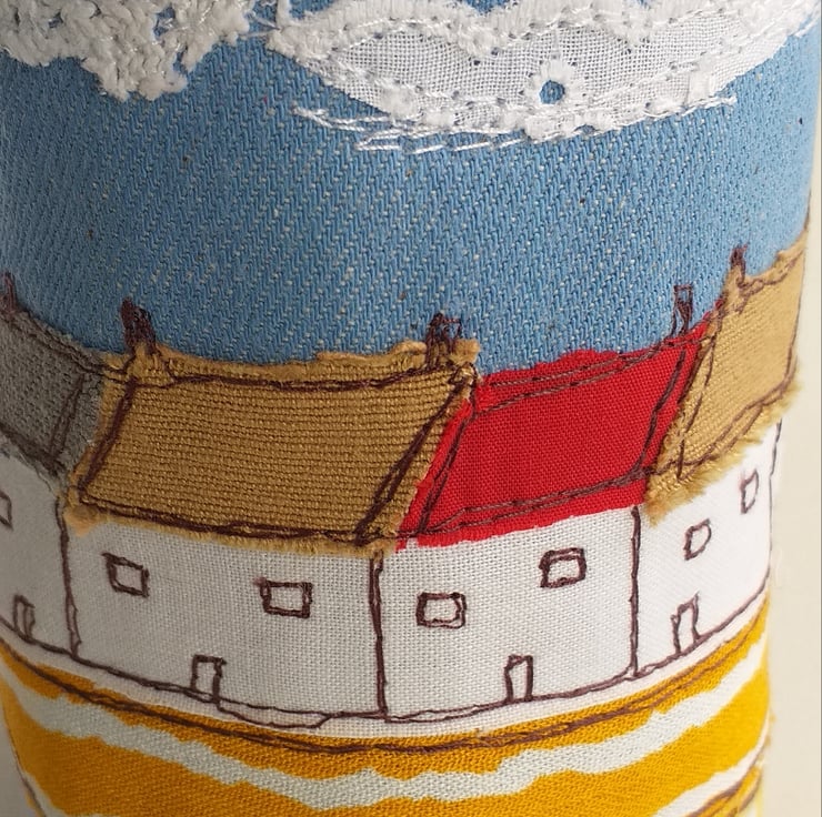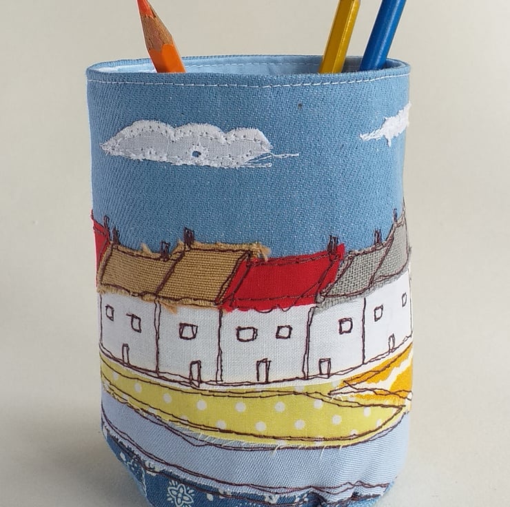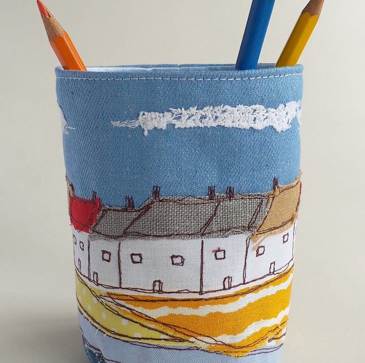 This quirky pencil pot is made out of stiffened canvas with a cotton lining. It features a row of houses by the sea, inspired by Anstruther on the Fife Coast. The design is made in freestyle machine embroidery using appliqued scraps of fabric.