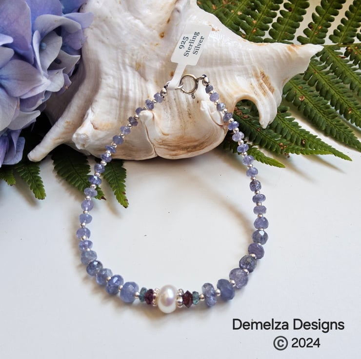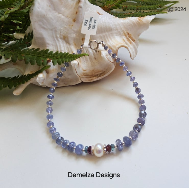 A sweet feminine luxurious bracelet designed and hand crafted for those whom value and enjoy wearing this increasingly rare genuine gemstone called tanzanit. The bracelets main gemstone is 'A' (bead) grade tanzanite rondelle cuts which graduate in size from front to back. In the centre of the bracelet is a quality button shape genuine freshwater culture pearl with a good even colour and a luxurious natural lacra formation. To complement the pearl are flat decorative sterling silver beads, rare faceted rhydolalite garnet and teal green kyanite rondelle cut gemstone beads. Within the design are 2mm sterling silver beads adding an opulent luxurious sparkling look during wear. For the item's main construction 1.0 guage professional coated stainless steel jewellers wire has been used for added strength and lasting durability, finished off with a 7mm sterling silver bolt ring clasp, closed jump ring and crimp bead covers.