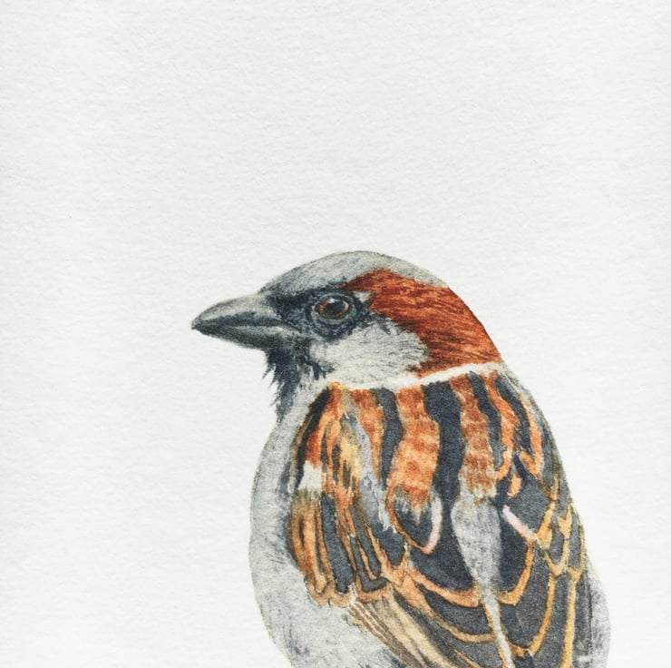 A 20 cm x 20 cm print of a watercolour painting of a house sparrow. The print is on 310 gsm acid-free, German Hahnemühle etching paper, which has a slight texture.