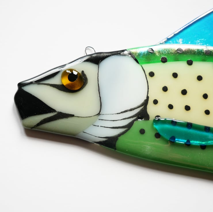How it's made - After cutting the various pieces of glass needed and adding the bead decorations, I add two hanging hooks and fire at a high temperature to fuse the body into a single, smooth piece of glass. Then I add fins, painted enamel detailing and a handmade glass eye and fuse again at a medium temperature to ensure the final piece retains a shimmering 3D effect.