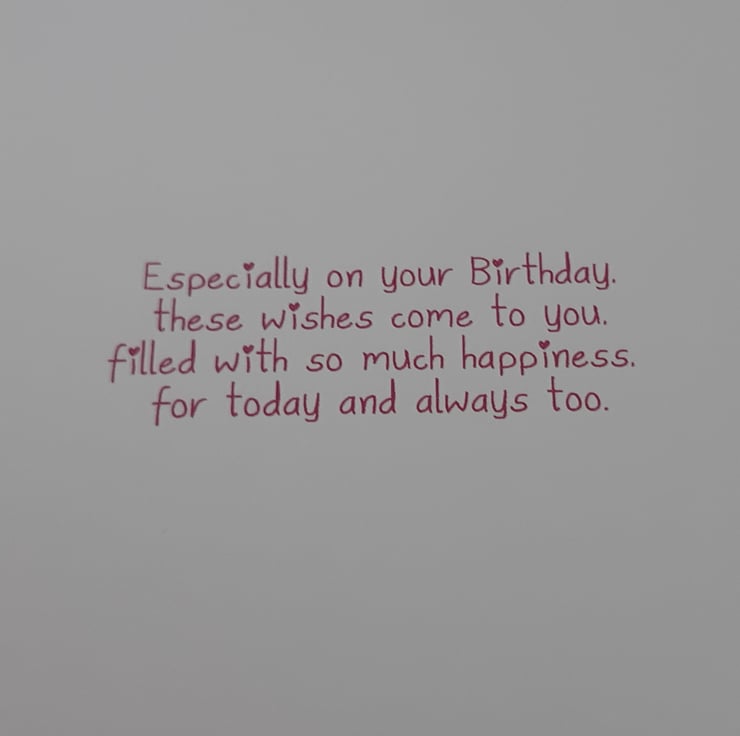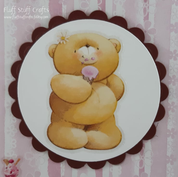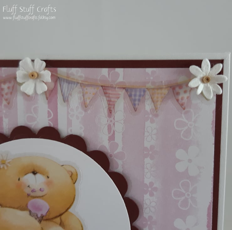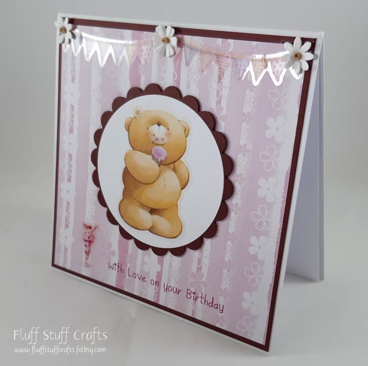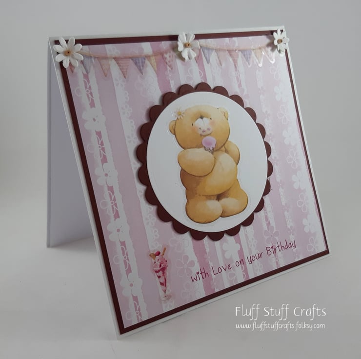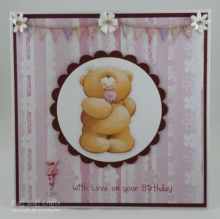 Square birthday card featuring a Forever Friends bear eating an ice cream. The image has been framed in a scalloped circle of burgundy card over a floral pink and white background. The background has been embellished with bunting and paper flowers and the sentiment reads: 'With Love on your Birthday'.