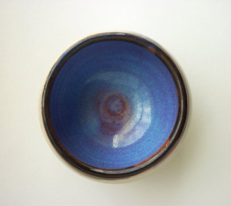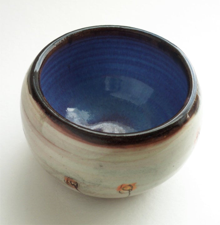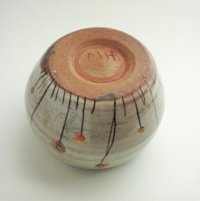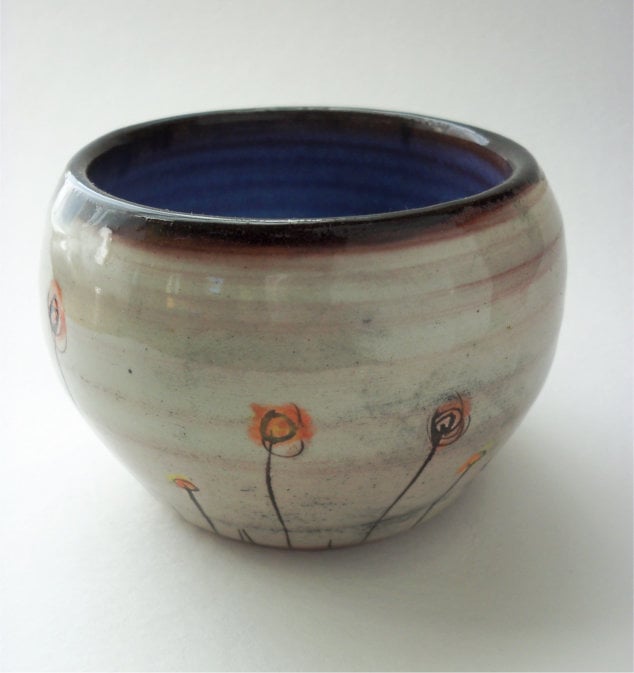 I have hand thrown this on the wheel, and then decorated with a white slip. I have used the sgraffito technique to incorporate my design.