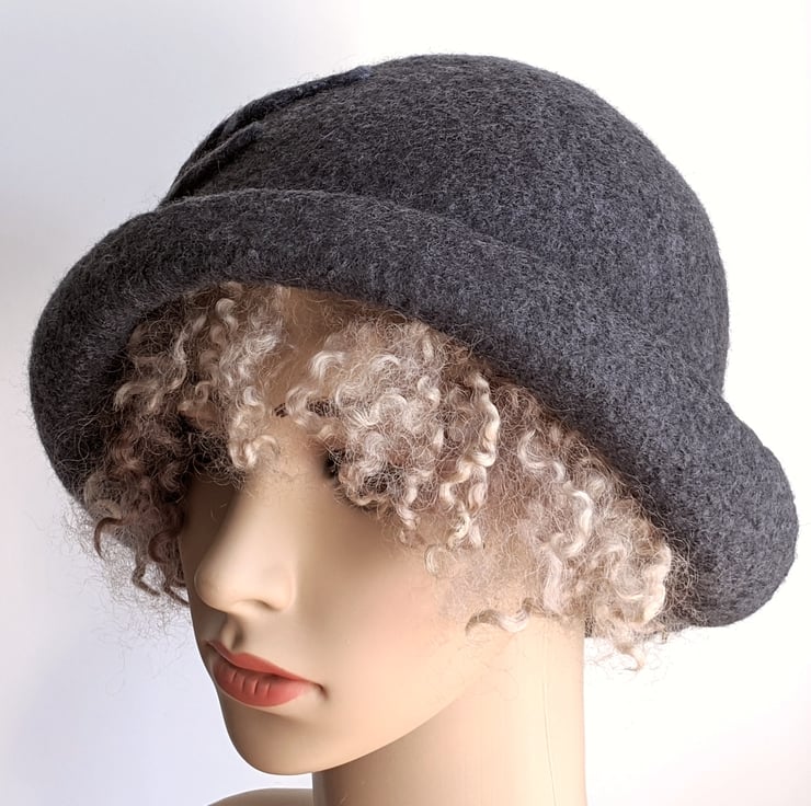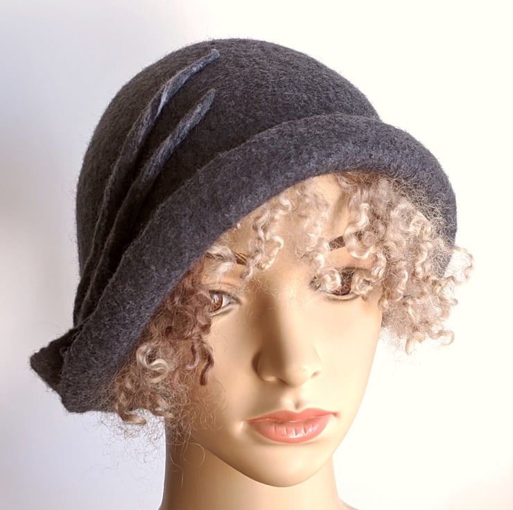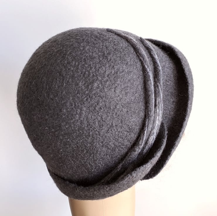 Handmade wet felted pewter grey colour wool cloche hat, with a unique double brim feature. A sweet feminine vintage style, with an asymmetrical brim and a matching trim.