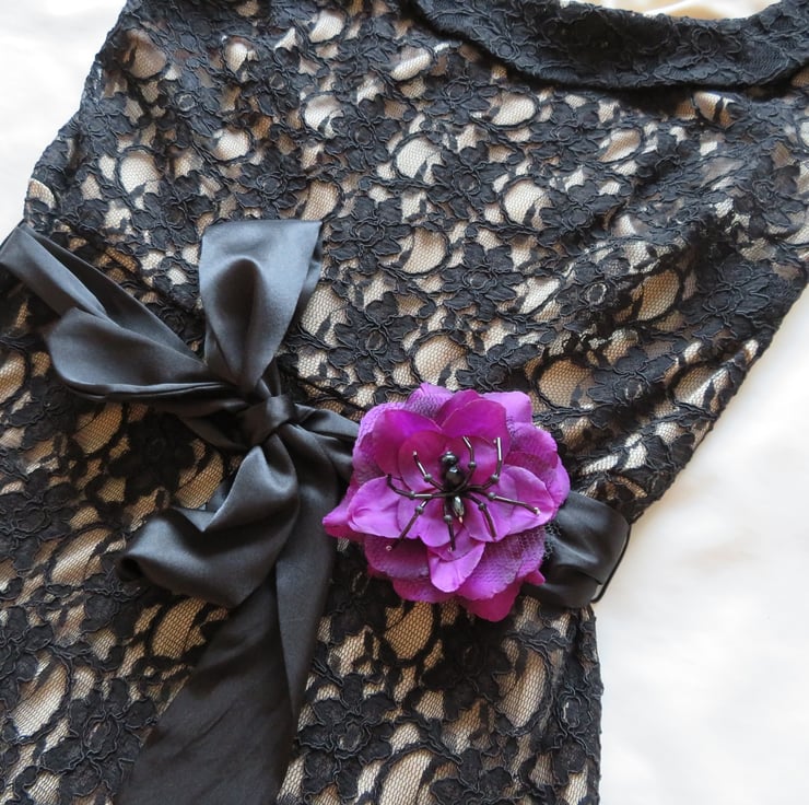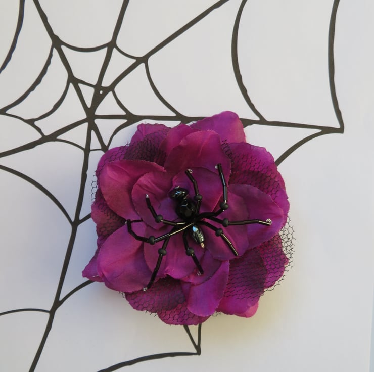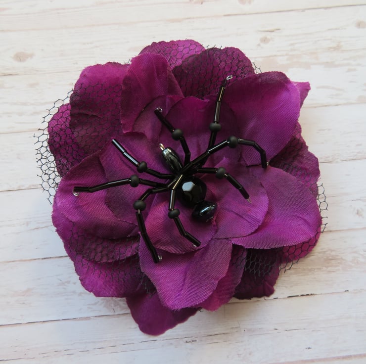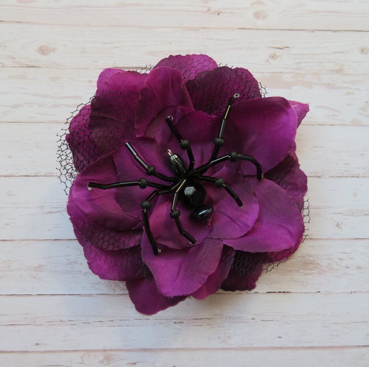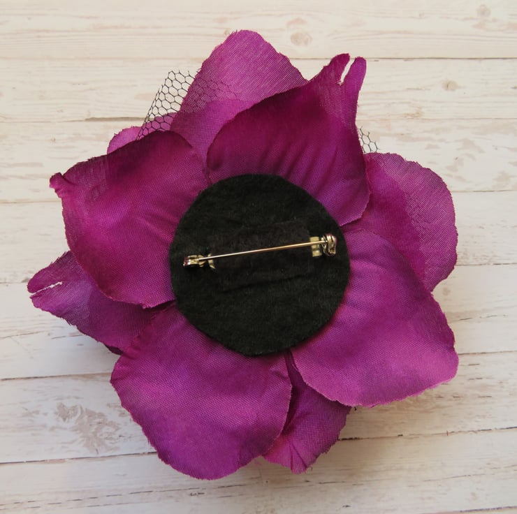 Handcrafted with an amethyst fabric rose with black tulle petals.