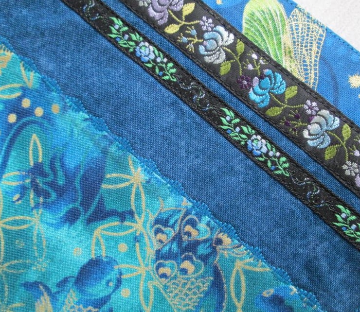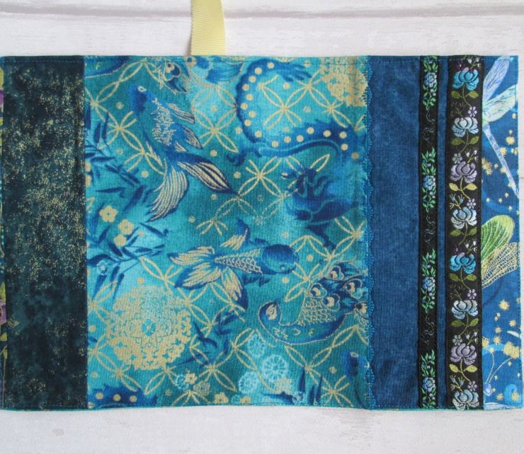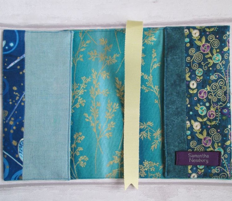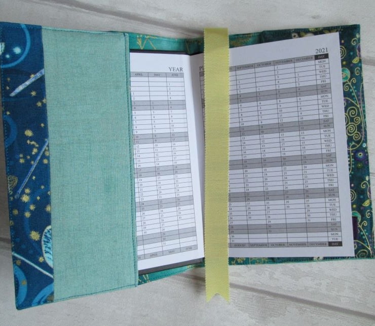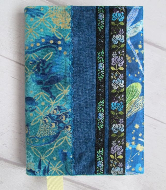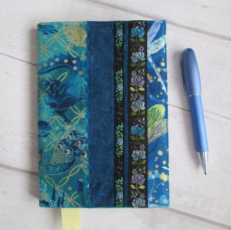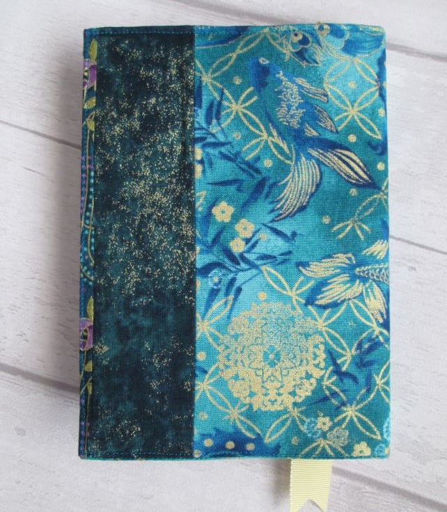 A striking notebook/diary cover made up from some of the treasure in my scrap box. Shades of teal and turquoise, with glimpses of dragonfly wings, peacocks and gold shimmered koi carp. Finished with a turquoise ombre lining printed with metallic gold grasses, some pretty woven braids and a ribbon place marker, this is a one of a kind cover. It comes with either a hardback lined notebook or, for £1.00 extra a 2021 week to view diary.