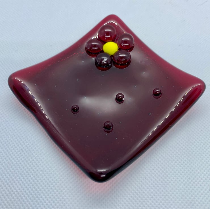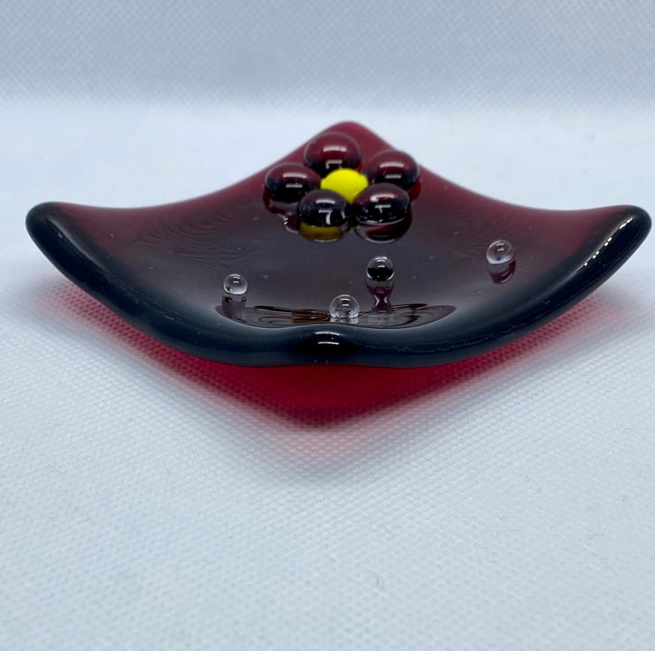 This gently sloping dish is made from a gorgeous transparent cranberry coloured glass and decorated with a flower with a bright yellow centre. Measuring 8cm x 8cm it is perfect to hold earrings or trinkets or as a little display piece in any room of your home. It would also make a great little gift.
