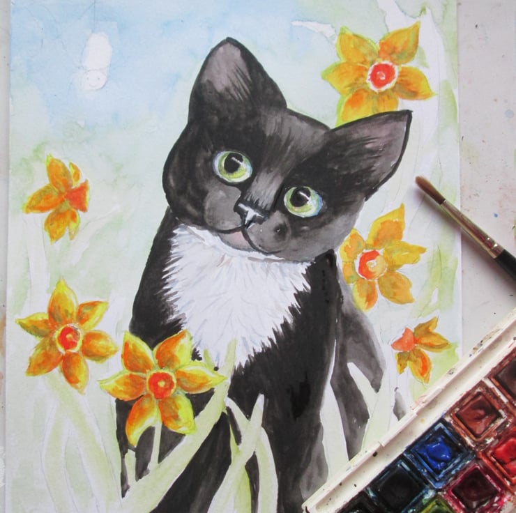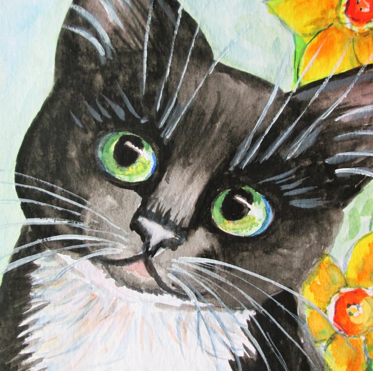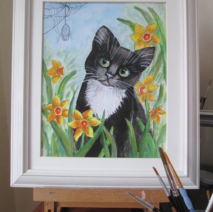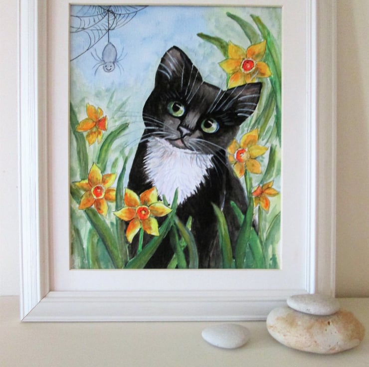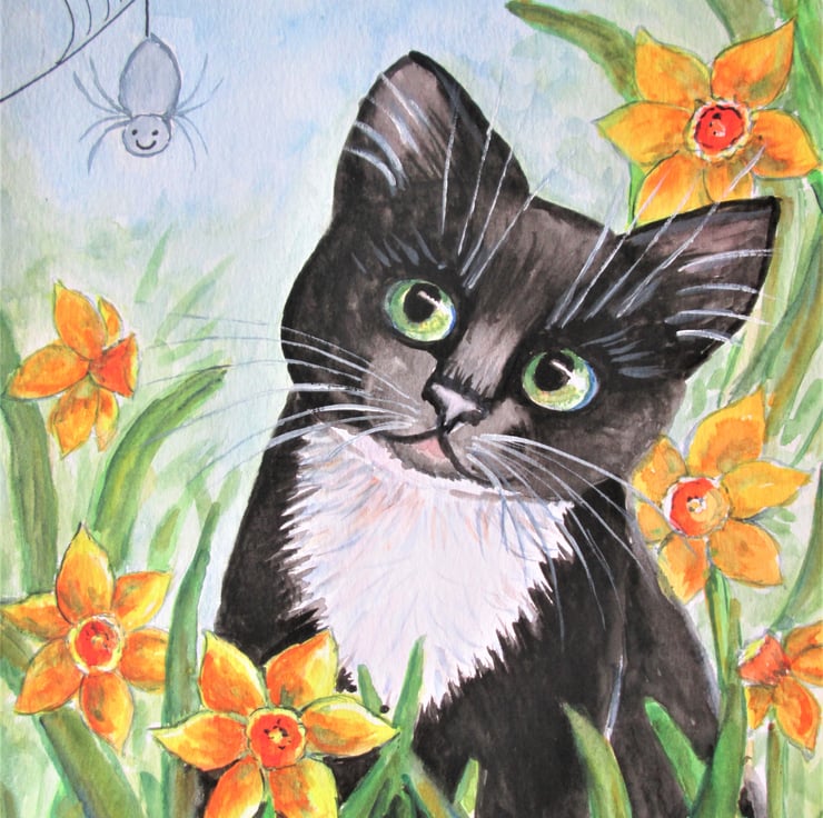 A sweet tuxedo kitten among daffodils and a spider. Black cat and Spider.
