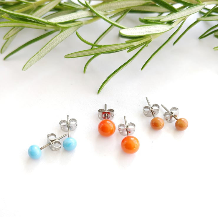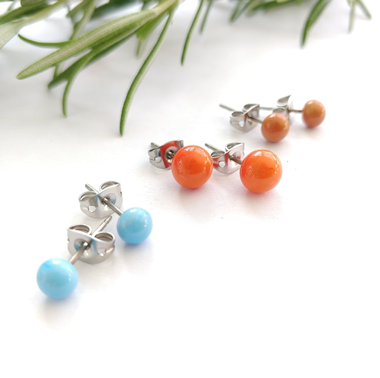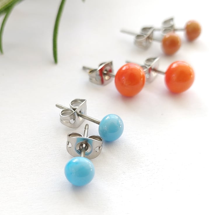 These earrings are designed to last! They have been created using a technique called lampworking which means that the post gets set into the glass. Therefore zero adhesive has been used to attach the post to the glass (which eventually would fail over time). The studs are annealed in the kiln too which adds extra strength to the glass and makes them super durable. These studs can be worn swimming, in the shower, under the heat of a hairdryer etc and they tollerate being dropped and trodden on really well! Amazing right!