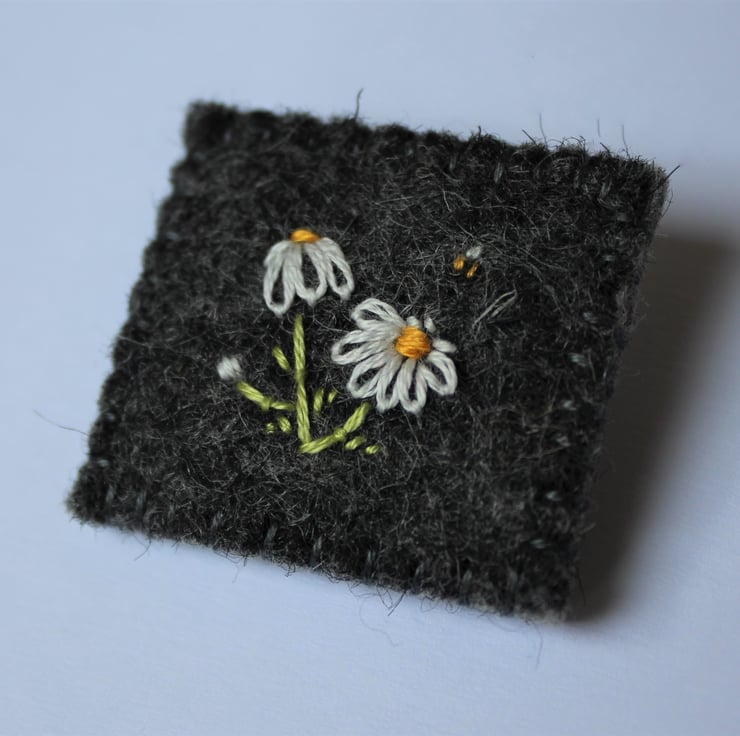 A dark grey pure wool felt brooch embroidered with camomile (or chamomile) flowers and a little buzzing bee flying over them. This is a sweet design of a much loved British wildflower that has been used medicinally for centuries. I can't promise any medicinal benefits from wearing this brooch but it is a very pretty accessory that would certainly be a benefit to any outfit :) whether you decide to pin it to a cardi or lapel, a handbag or even your hat!