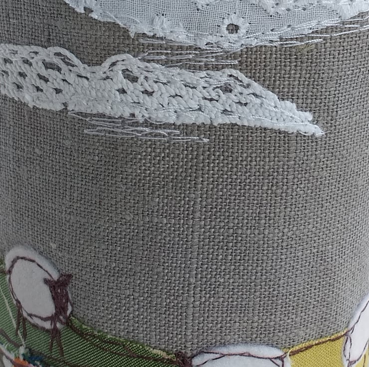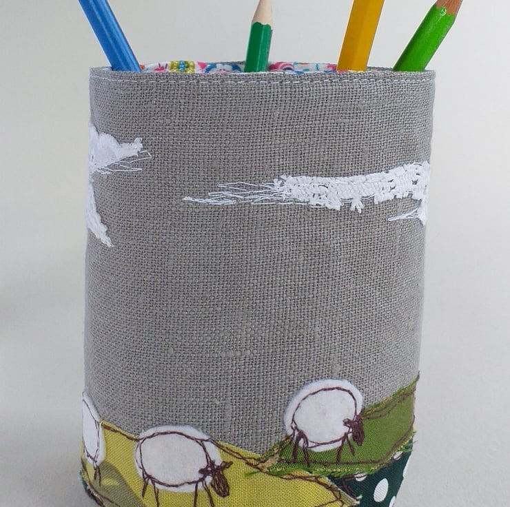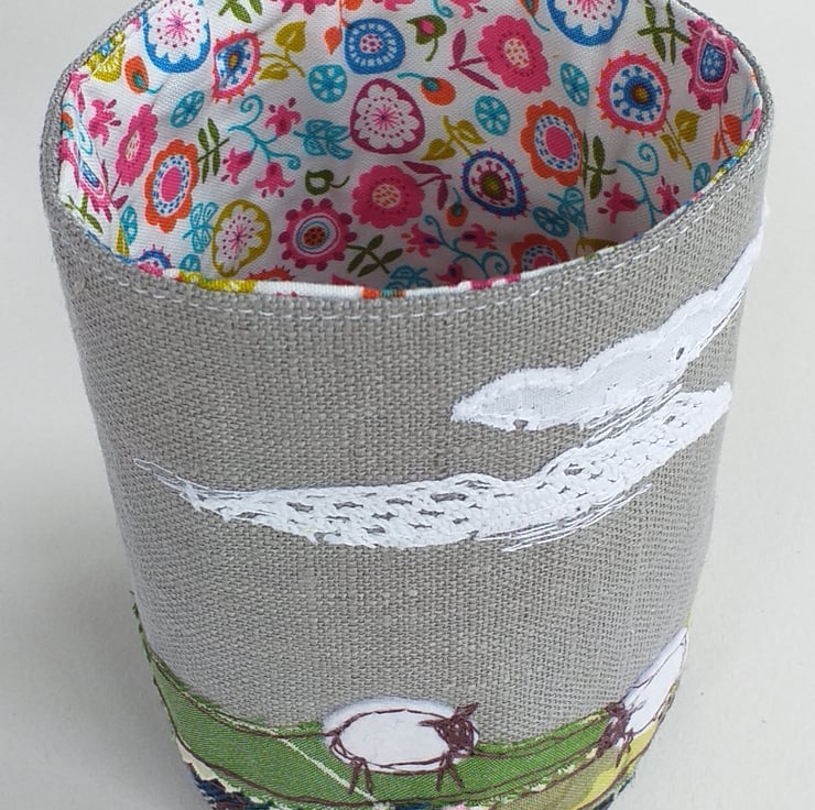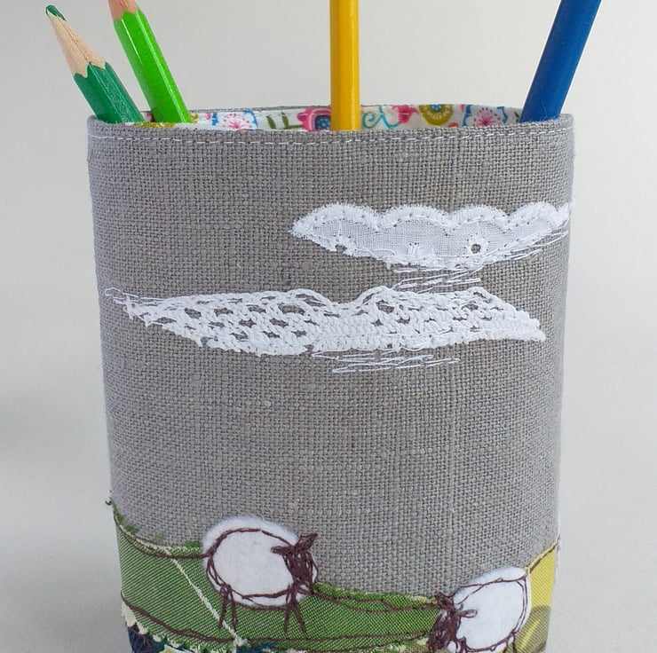 This delightful pencil pot is made out of stiffened grey linen with a bright floral cotton lining. It features a scene of sheep peacefully grazing in a field. The design is done in freestyle machine embroidery using appliqued fabric scraps.